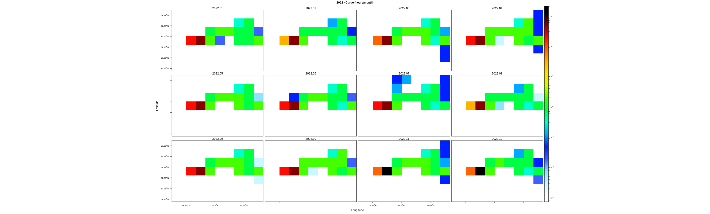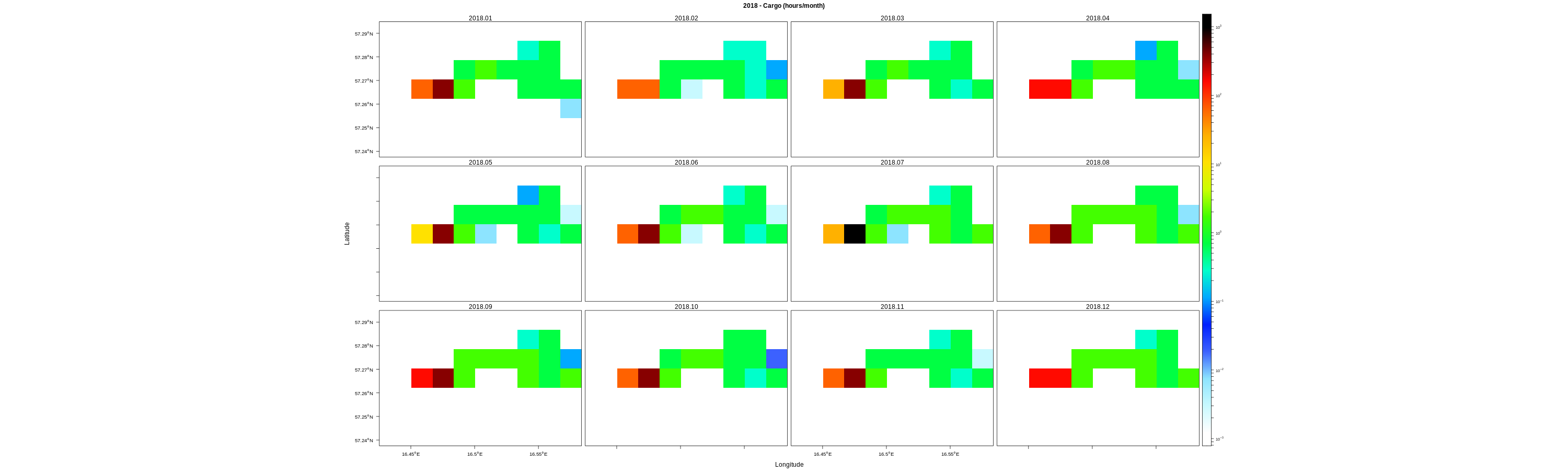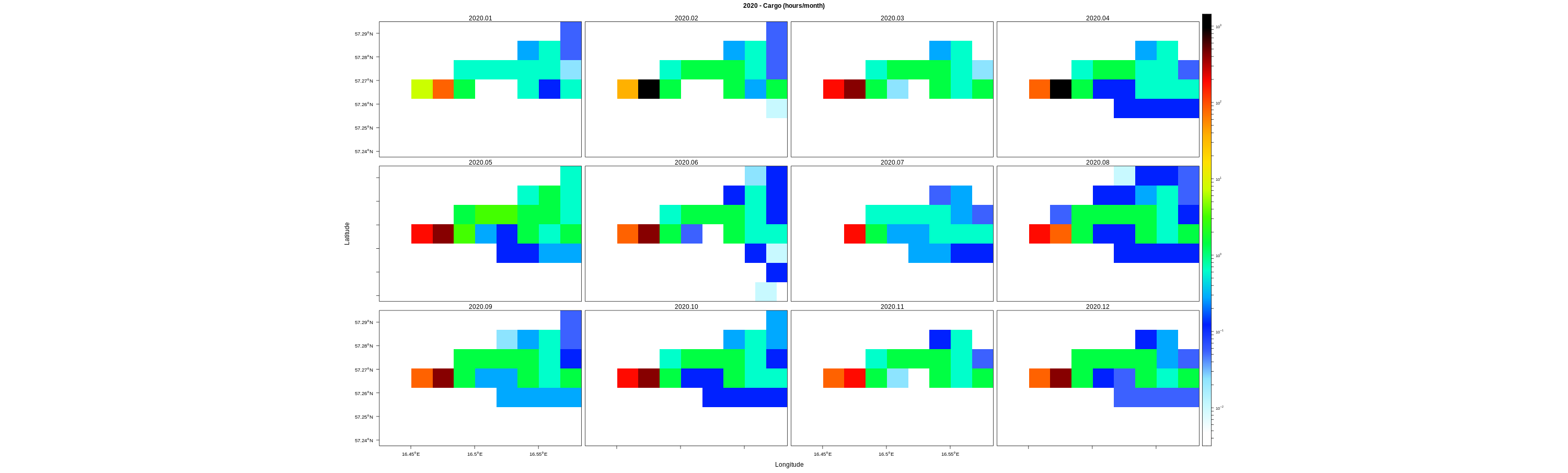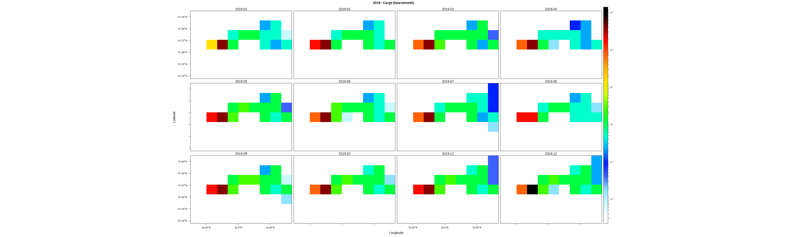 EMODnet Vessel Density maps were created by Cogea in 2019 in the framework of EMODnet Human Activities, an initiative funded by the EU Commission. The maps are based on AIS data purchased by Collecte Localisation Satellites (CLS) and ORBCOMM. The maps show shipping density in 1km*1km cells of a grid covering all EU waters (and some neighbouring areas). Density is expressed as hours per square kilometre per month. The following ship types are available:0 Other, 1 Fishing, 2 Service, 3 Dredging or underwater ops, 4 Sailing, 5 Pleasure Craft, 6 High speed craft, 7 Tug and towing, 8 Passenger, 9 Cargo, 10 Tanker, 11 Military and Law Enforcement, 12 Unknown and All ship types. Data are available by month of year. Yearly averages are also available.