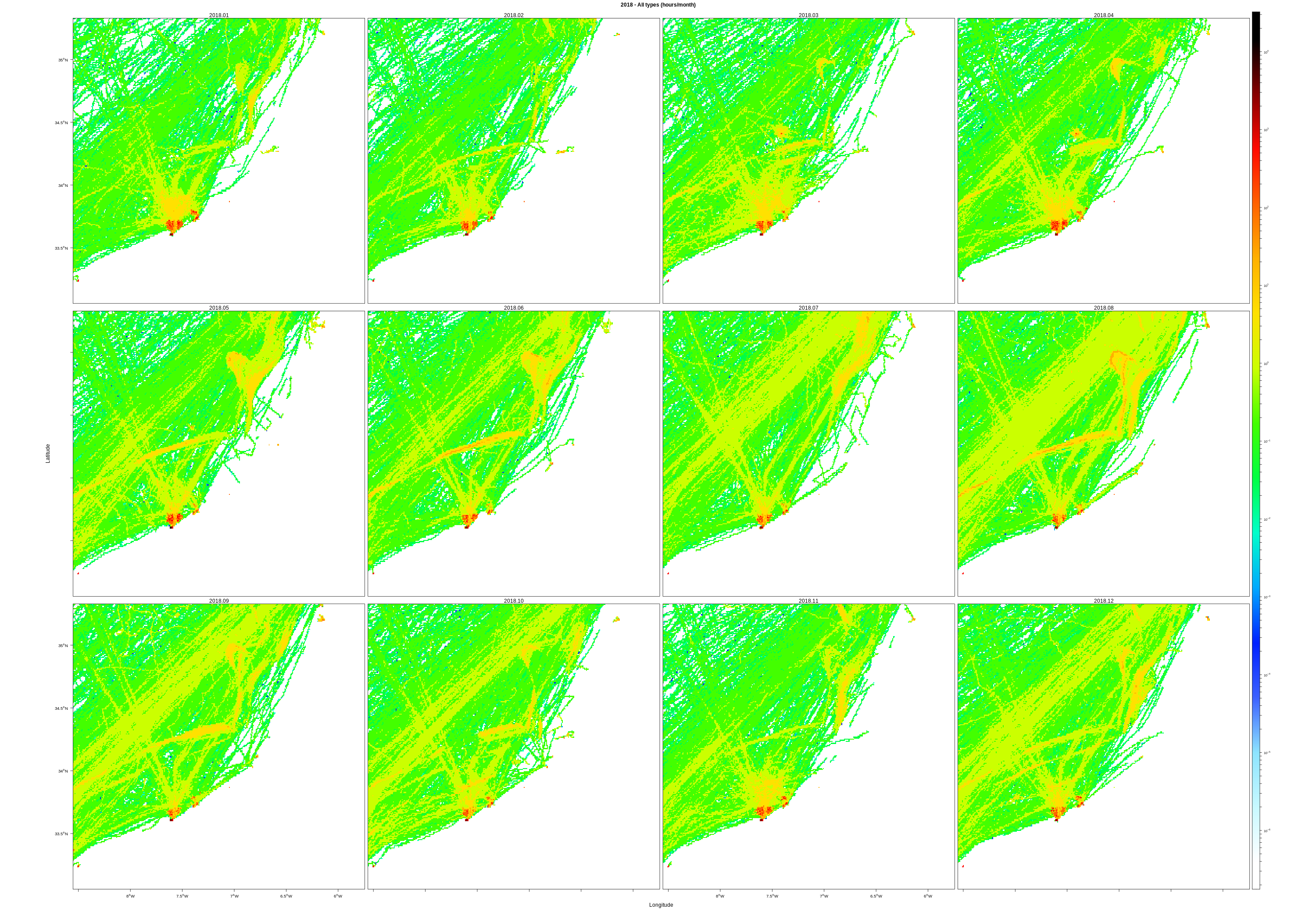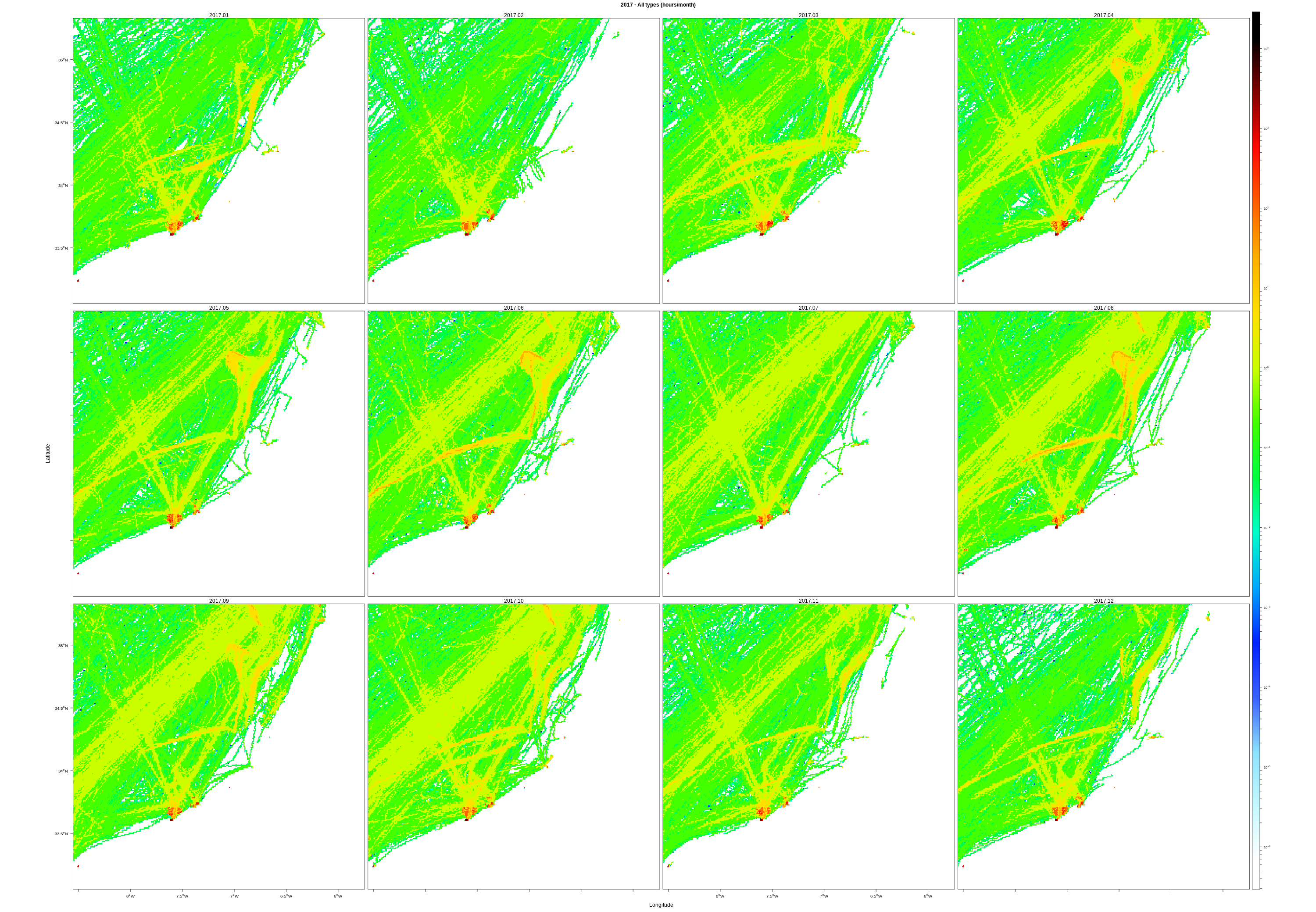 EMODnet Vessel Density maps were created by Cogea in 2019 in the framework of EMODnet Human Activities, an initiative funded by the EU Commission. The maps are based on AIS data purchased by Collecte Localisation Satellites (CLS) and ORBCOMM. The maps show shipping density in 1km*1km cells of a grid covering all EU waters (and some neighbouring areas). Density is expressed as hours per square kilometre per month. The following ship types are available:0 Other, 1 Fishing, 2 Service, 3 Dredging or underwater ops, 4 Sailing, 5 Pleasure Craft, 6 High speed craft, 7 Tug and towing, 8 Passenger, 9 Cargo, 10 Tanker, 11 Military and Law Enforcement, 12 Unknown and All ship types. Data are available by month of year. Yearly averages are also available.