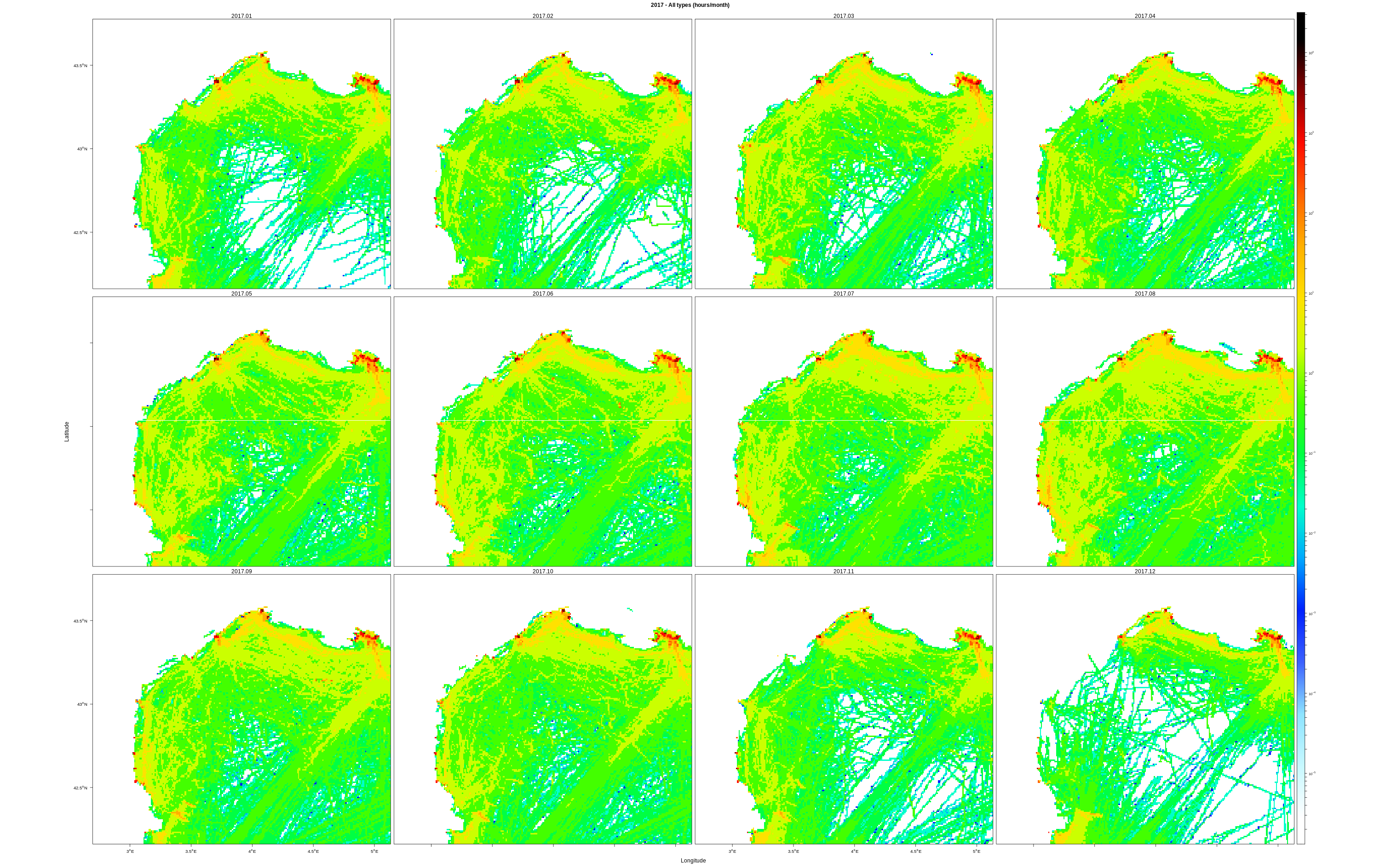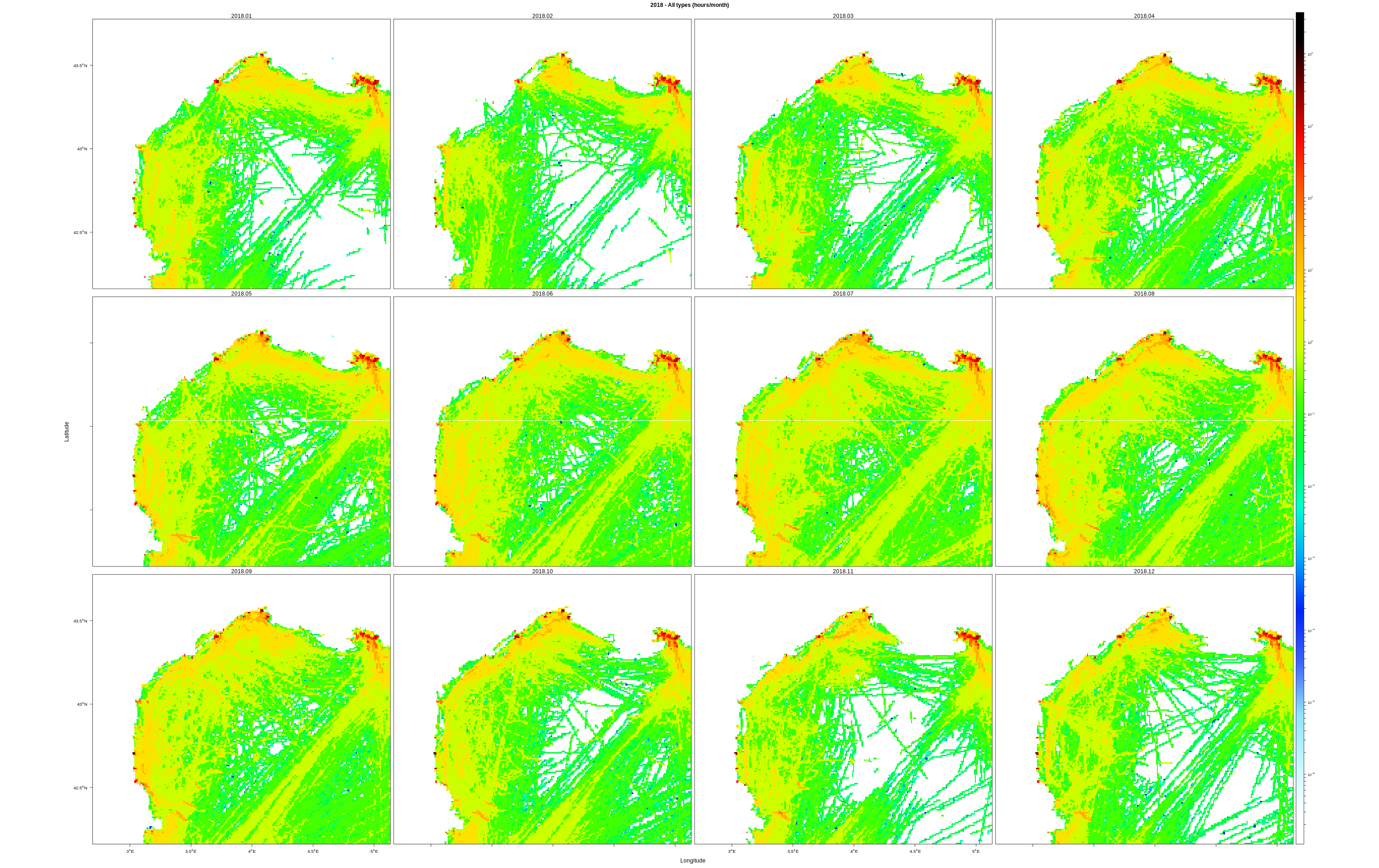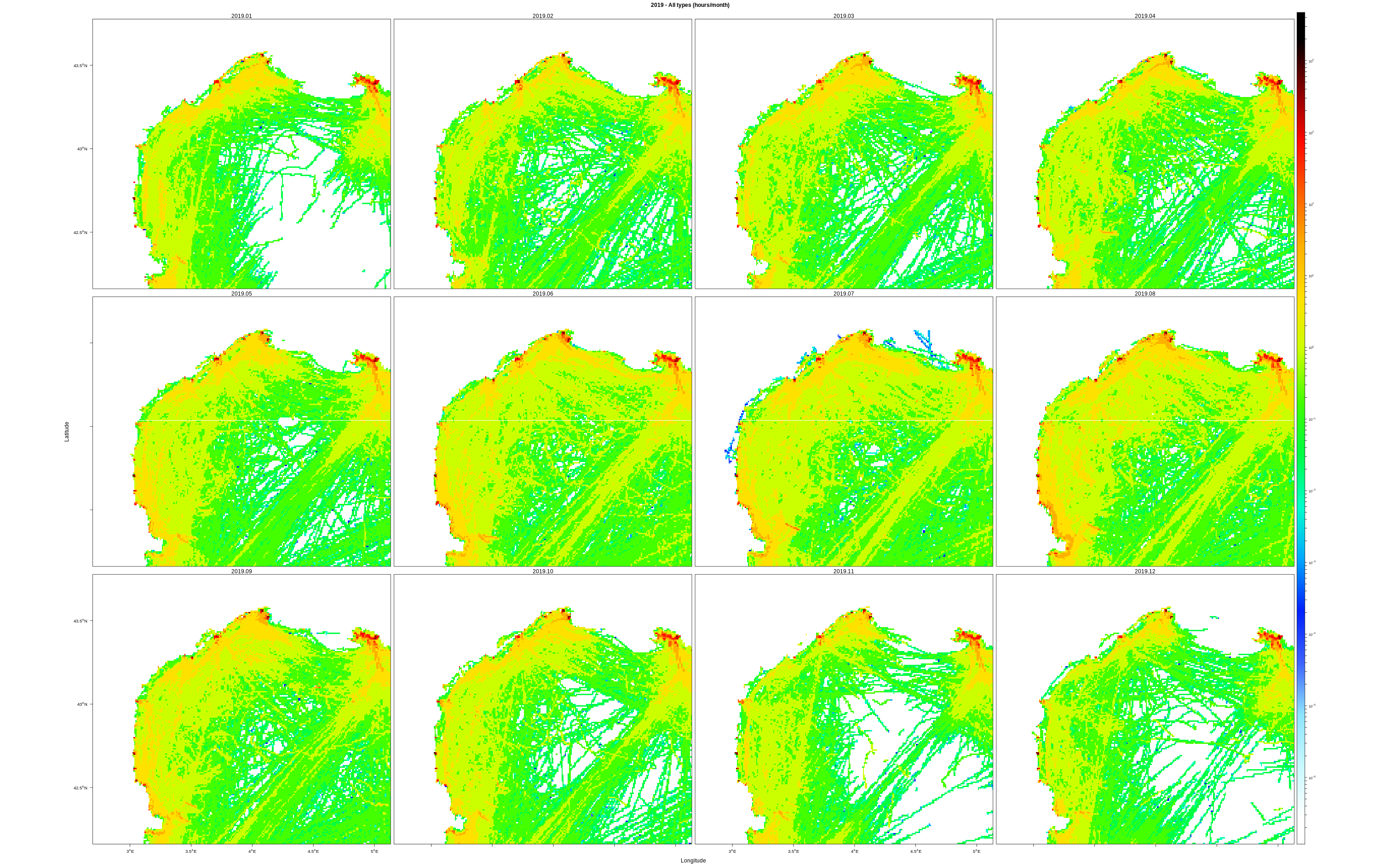 EMODnet Vessel Density maps were created by Cogea in 2019 in the framework of EMODnet Human Activities, an initiative funded by the EU Commission. The maps are based on AIS data purchased by Collecte Localisation Satellites (CLS) and ORBCOMM. The maps show shipping density in 1km*1km cells of a grid covering all EU waters (and some neighbouring areas). Density is expressed as hours per square kilometre per month. The following ship types are available:0 Other, 1 Fishing, 2 Service, 3 Dredging or underwater ops, 4 Sailing, 5 Pleasure Craft, 6 High speed craft, 7 Tug and towing, 8 Passenger, 9 Cargo, 10 Tanker, 11 Military and Law Enforcement, 12 Unknown and All ship types. Data are available by month of year. Yearly averages are also available.
