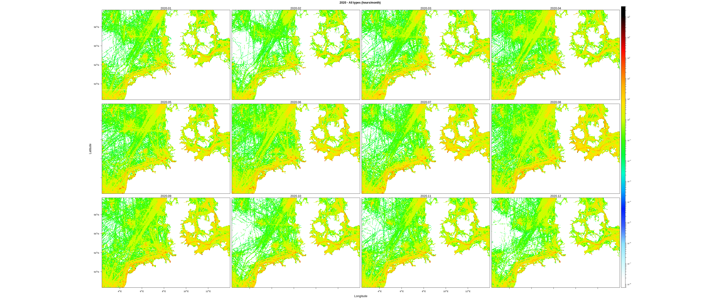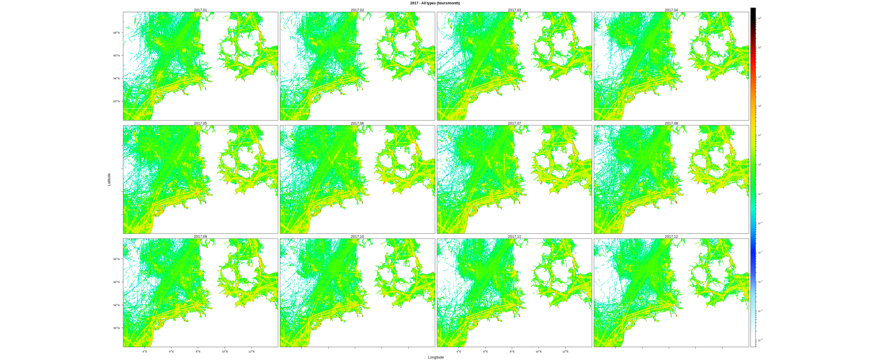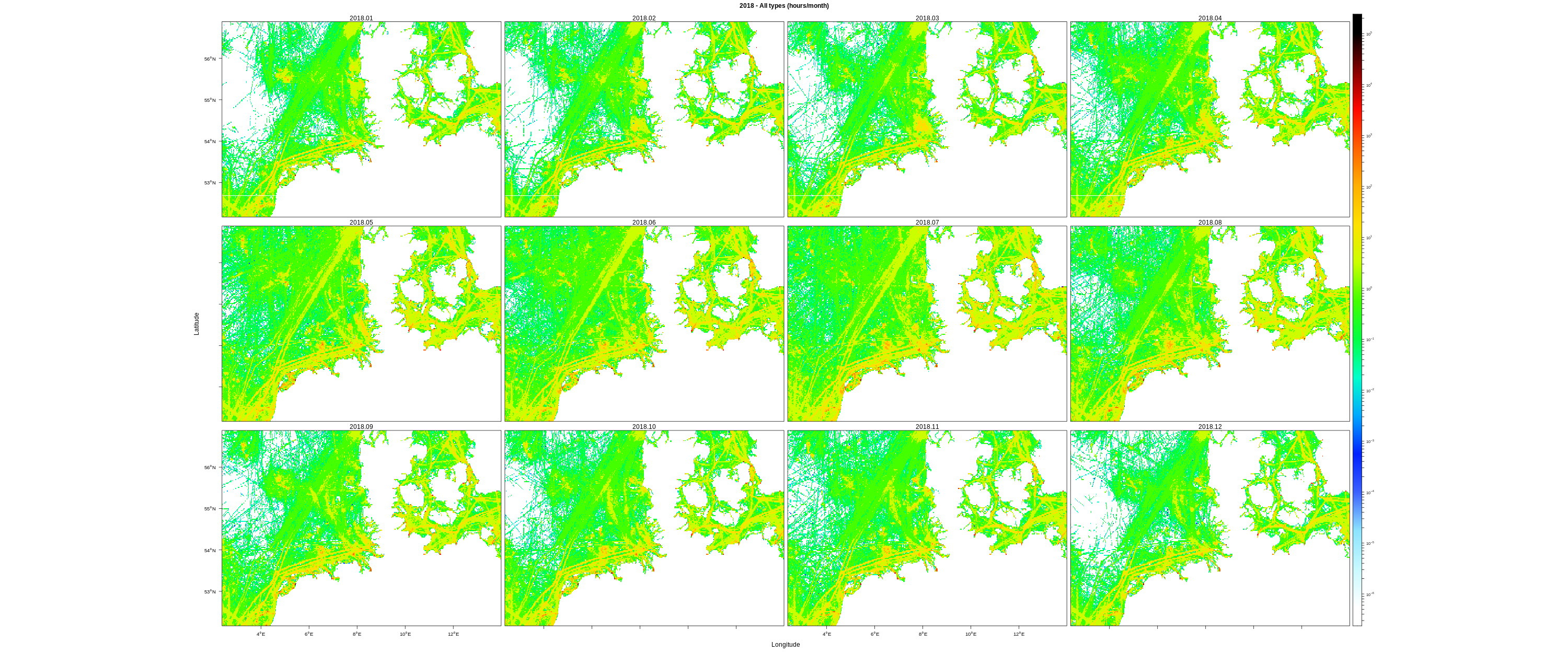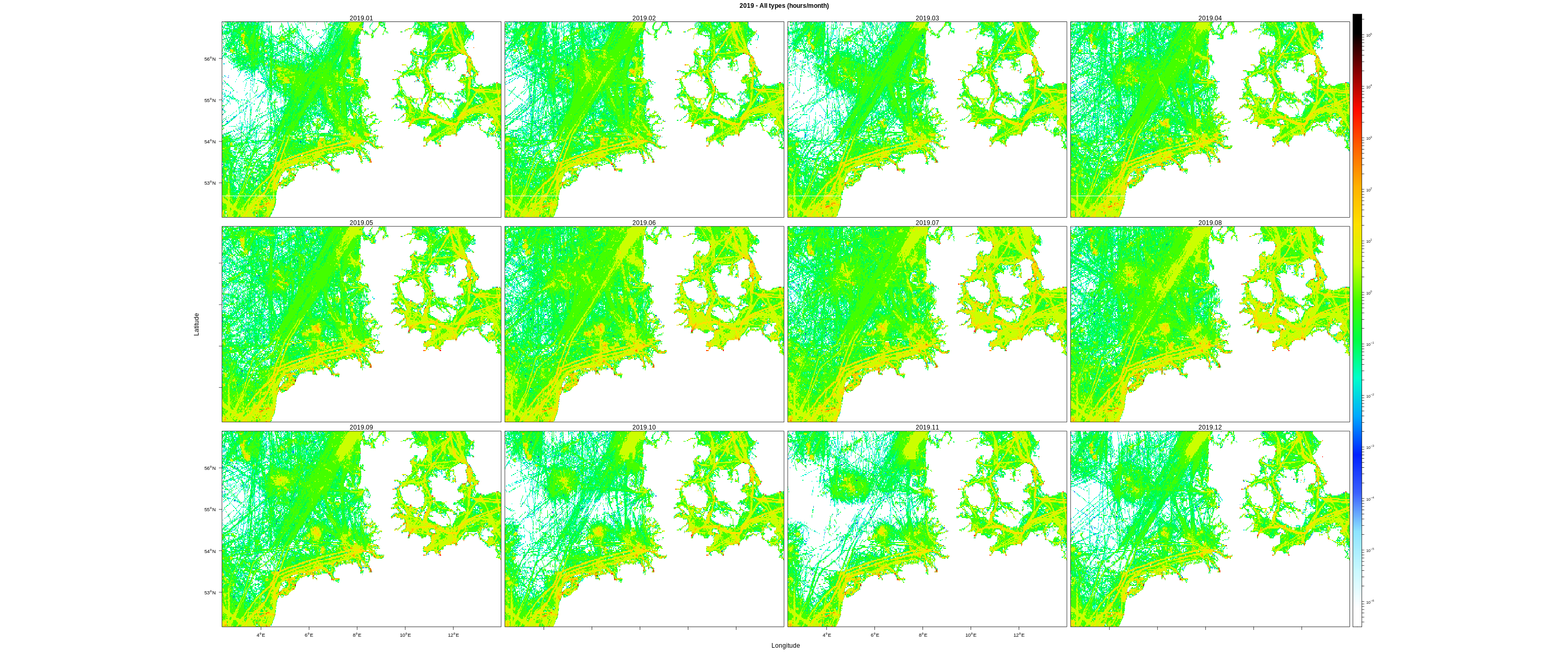 EMODnet Vessel Density maps were created by Cogea in 2019 in the framework of EMODnet Human Activities, an initiative funded by the EU Commission. The maps are based on AIS data purchased by Collecte Localisation Satellites (CLS) and ORBCOMM. The maps show shipping density in 1km*1km cells of a grid covering all EU waters (and some neighbouring areas). Density is expressed as hours per square kilometre per month. The following ship types are available:0 Other, 1 Fishing, 2 Service, 3 Dredging or underwater ops, 4 Sailing, 5 Pleasure Craft, 6 High speed craft, 7 Tug and towing, 8 Passenger, 9 Cargo, 10 Tanker, 11 Military and Law Enforcement, 12 Unknown and All ship types. Data are available by month of year. Yearly averages are also available.