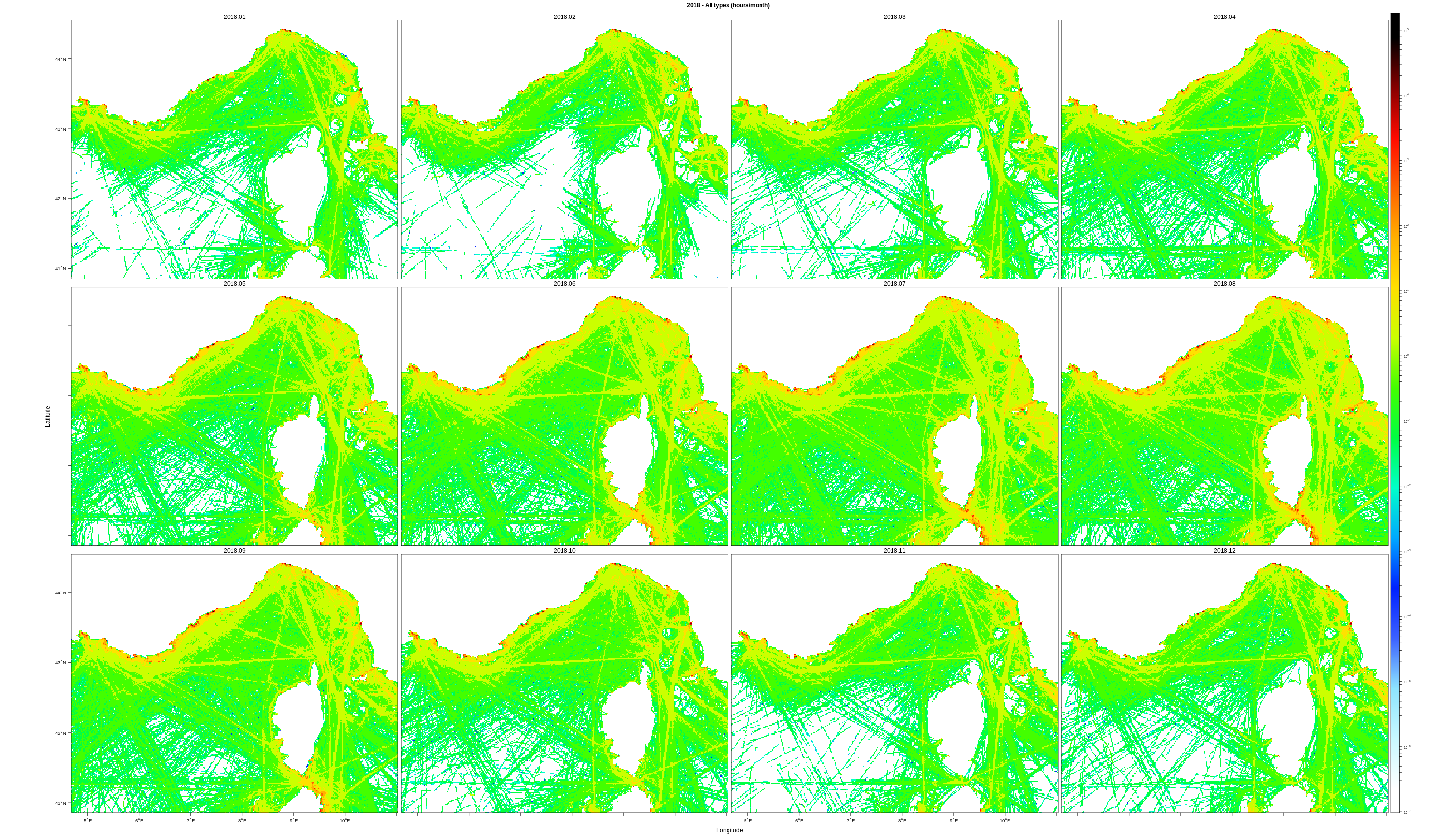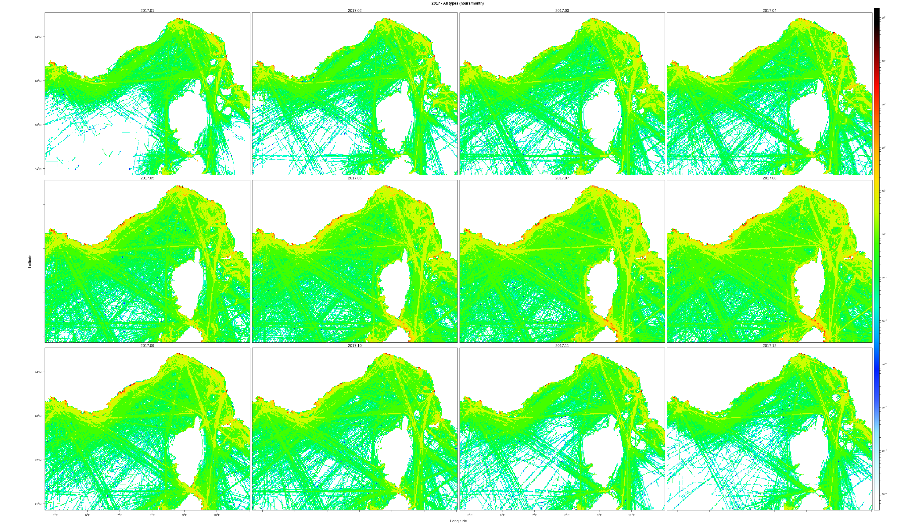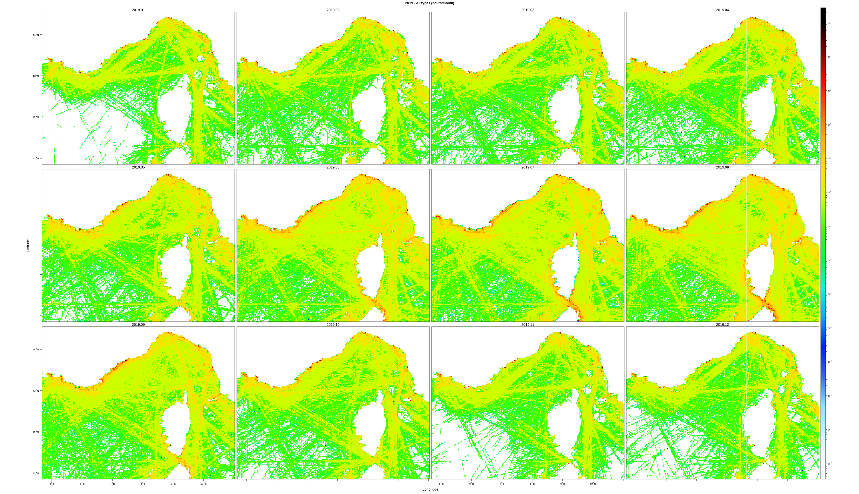 EMODnet Vessel Density maps were created by Cogea in 2019 in the framework of EMODnet Human Activities, an initiative funded by the EU Commission. The maps are based on AIS data purchased by Collecte Localisation Satellites (CLS) and ORBCOMM. The maps show shipping density in 1km*1km cells of a grid covering all EU waters (and some neighbouring areas). Density is expressed as hours per square kilometre per month. The following ship types are available:0 Other, 1 Fishing, 2 Service, 3 Dredging or underwater ops, 4 Sailing, 5 Pleasure Craft, 6 High speed craft, 7 Tug and towing, 8 Passenger, 9 Cargo, 10 Tanker, 11 Military and Law Enforcement, 12 Unknown and All ship types. Data are available by month of year. Yearly averages are also available.