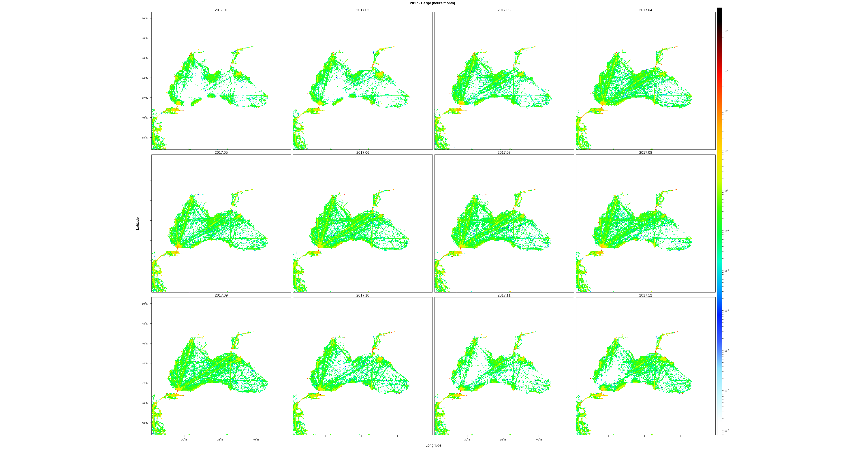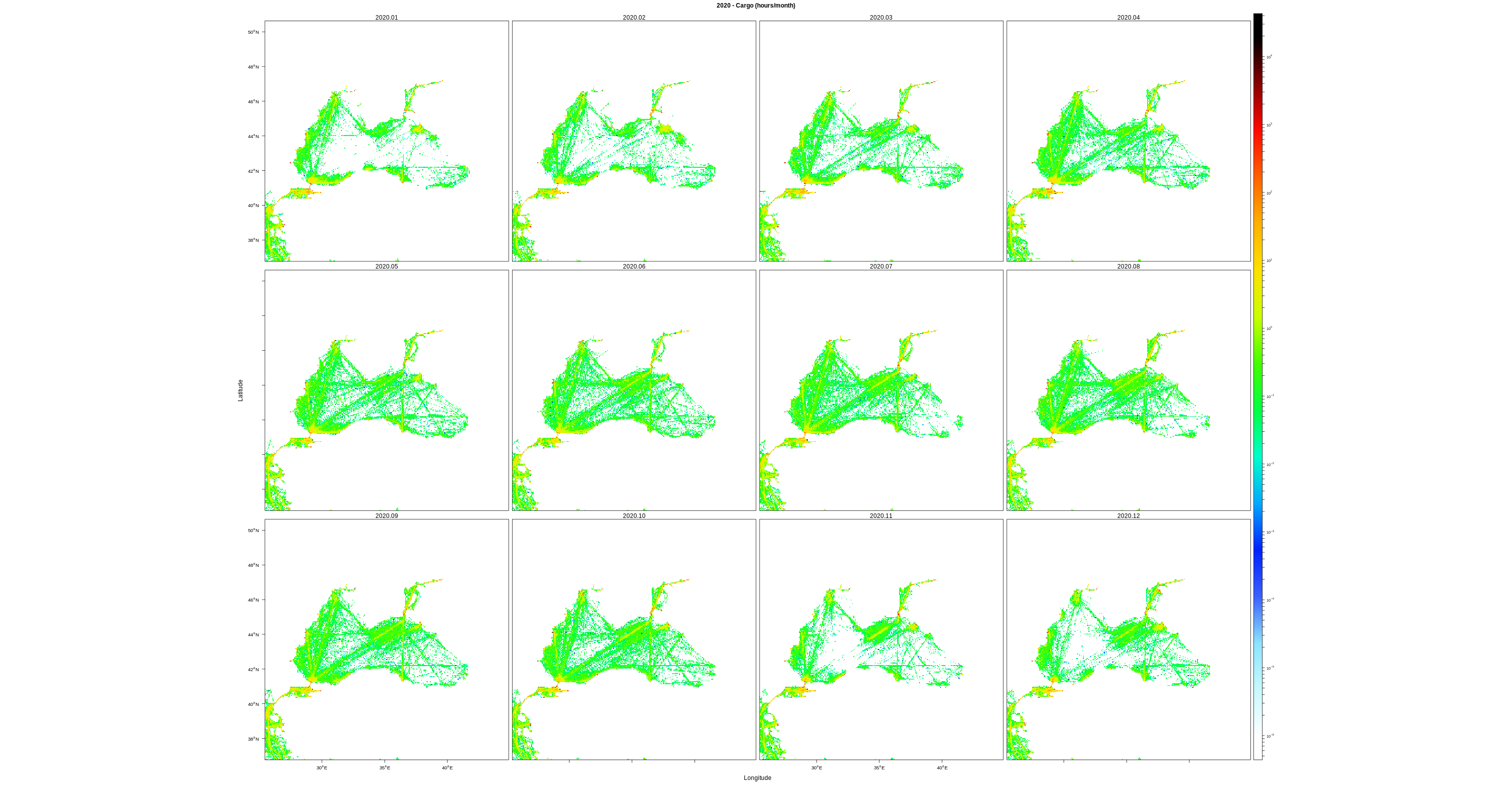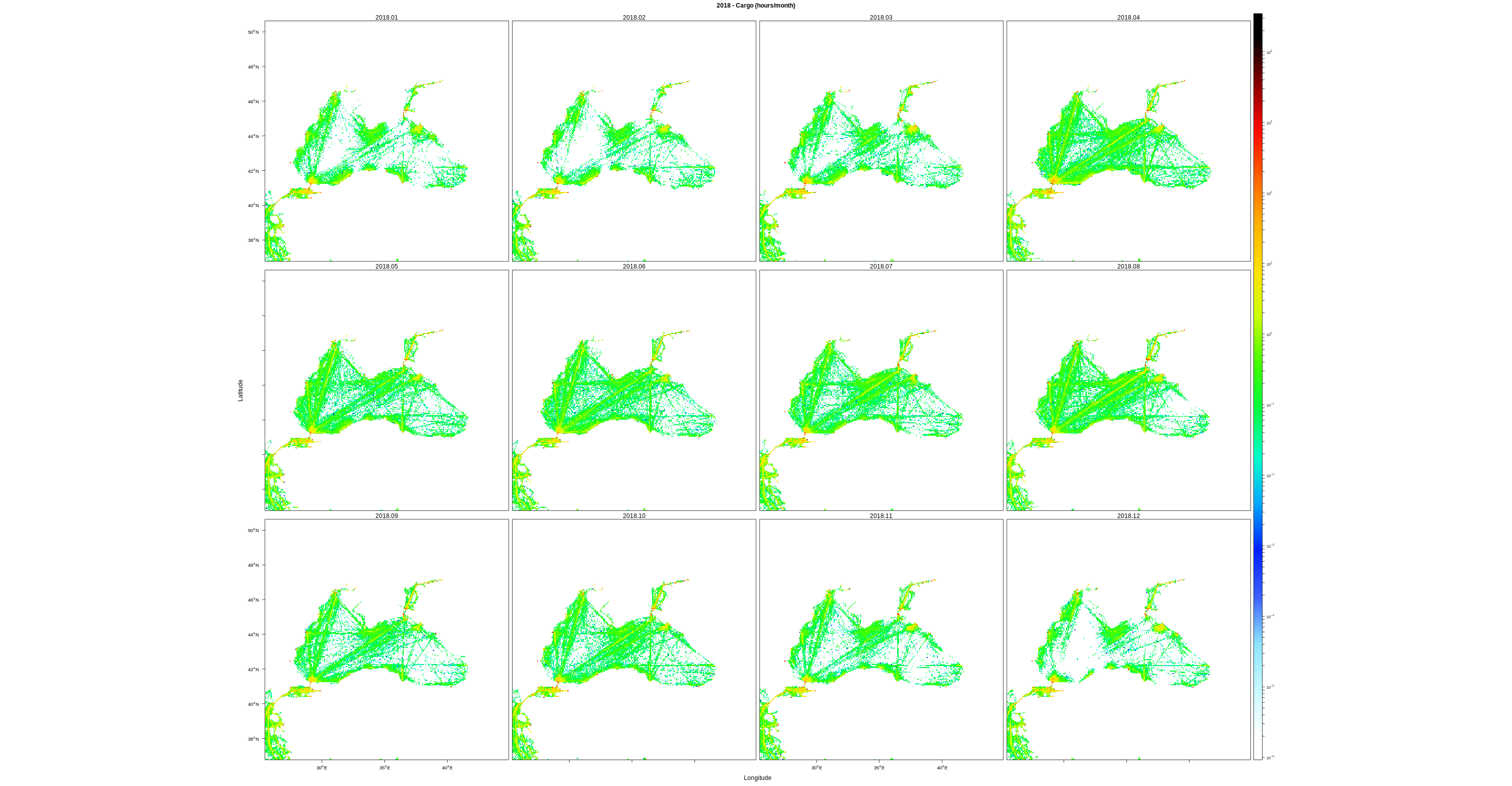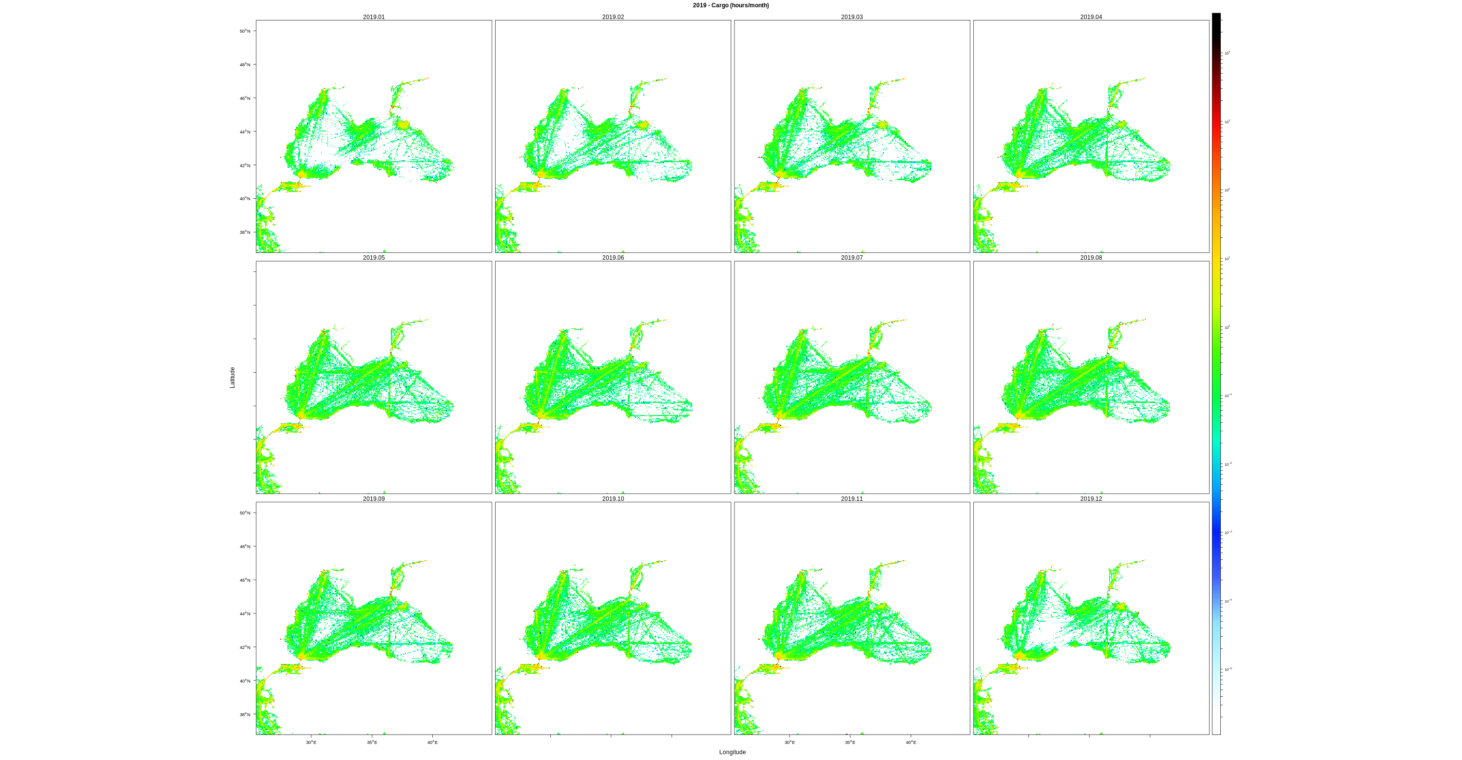 EMODnet Vessel Density maps were created by Cogea in 2019 in the framework of EMODnet Human Activities, an initiative funded by the EU Commission. The maps are based on AIS data purchased by Collecte Localisation Satellites (CLS) and ORBCOMM. The maps show shipping density in 1km*1km cells of a grid covering all EU waters (and some neighbouring areas). Density is expressed as hours per square kilometre per month. The following ship types are available:0 Other, 1 Fishing, 2 Service, 3 Dredging or underwater ops, 4 Sailing, 5 Pleasure Craft, 6 High speed craft, 7 Tug and towing, 8 Passenger, 9 Cargo, 10 Tanker, 11 Military and Law Enforcement, 12 Unknown and All ship types. Data are available by month of year. Yearly averages are also available.