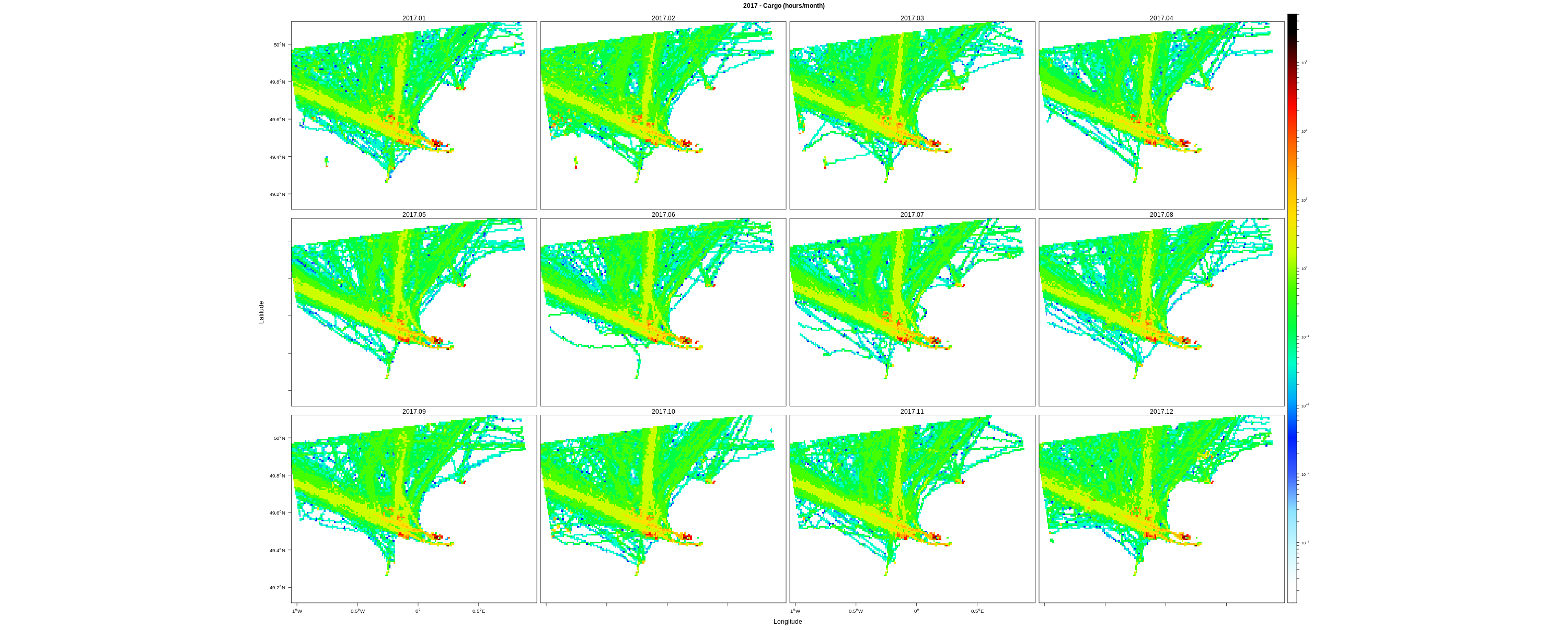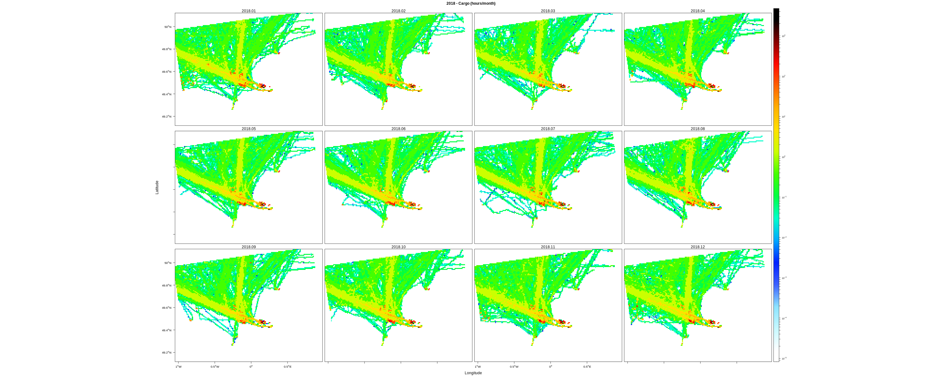 EMODnet Vessel Density maps were created by Cogea in 2019 in the framework of EMODnet Human Activities, an initiative funded by the EU Commission. The maps are based on AIS data purchased by Collecte Localisation Satellites (CLS) and ORBCOMM. The maps show shipping density in 1km*1km cells of a grid covering all EU waters (and some neighbouring areas). Density is expressed as hours per square kilometre per month. The following ship types are available:0 Other, 1 Fishing, 2 Service, 3 Dredging or underwater ops, 4 Sailing, 5 Pleasure Craft, 6 High speed craft, 7 Tug and towing, 8 Passenger, 9 Cargo, 10 Tanker, 11 Military and Law Enforcement, 12 Unknown and All ship types. Data are available by month of year. Yearly averages are also available.
