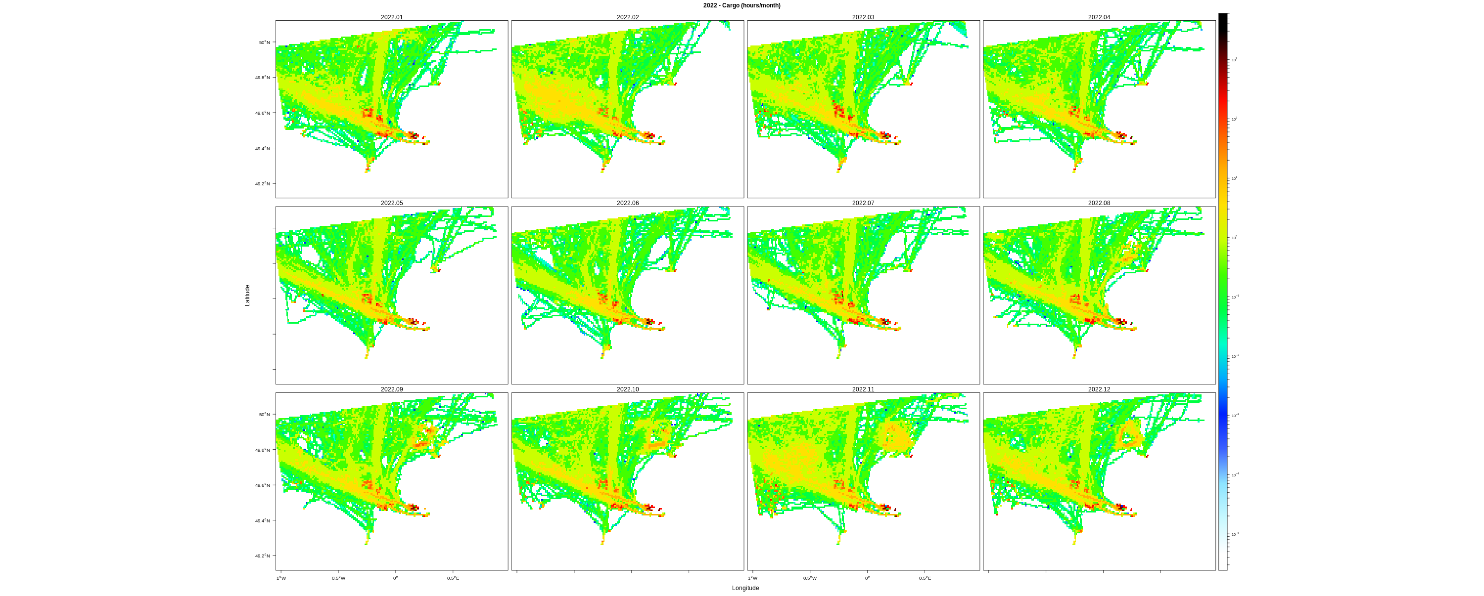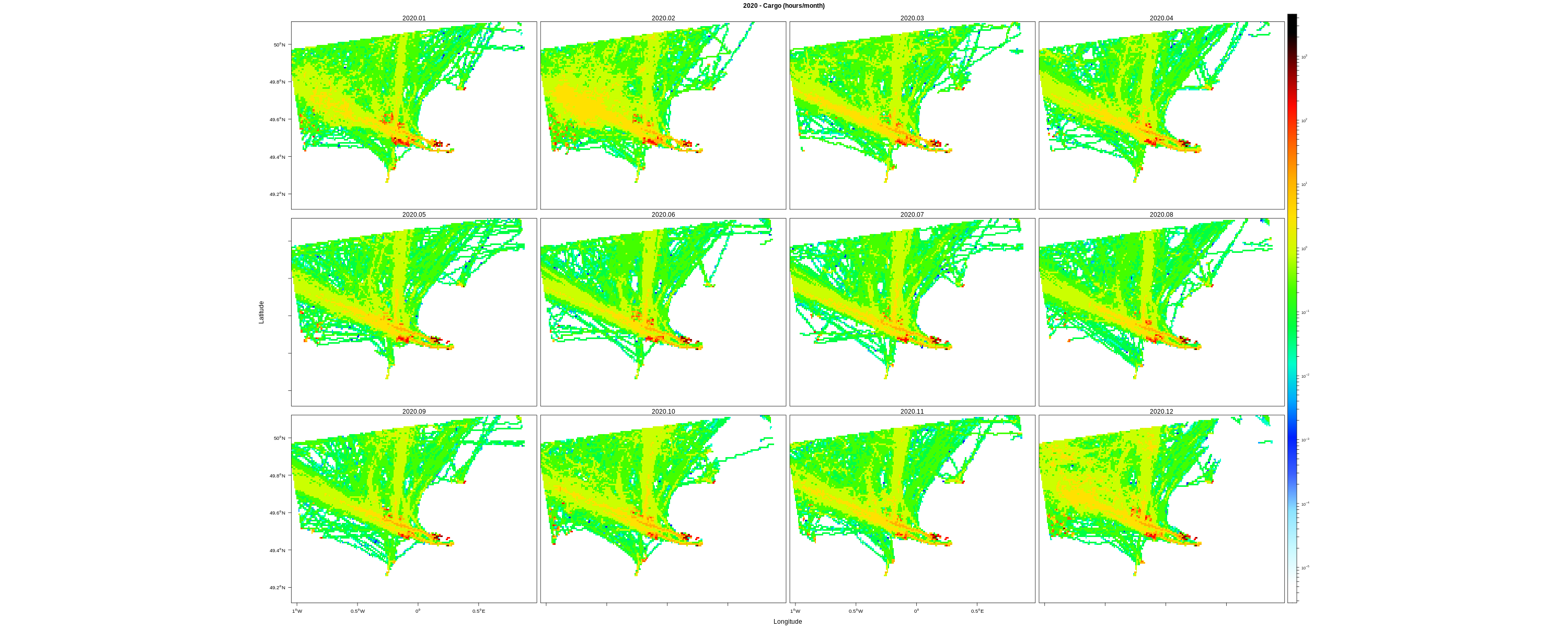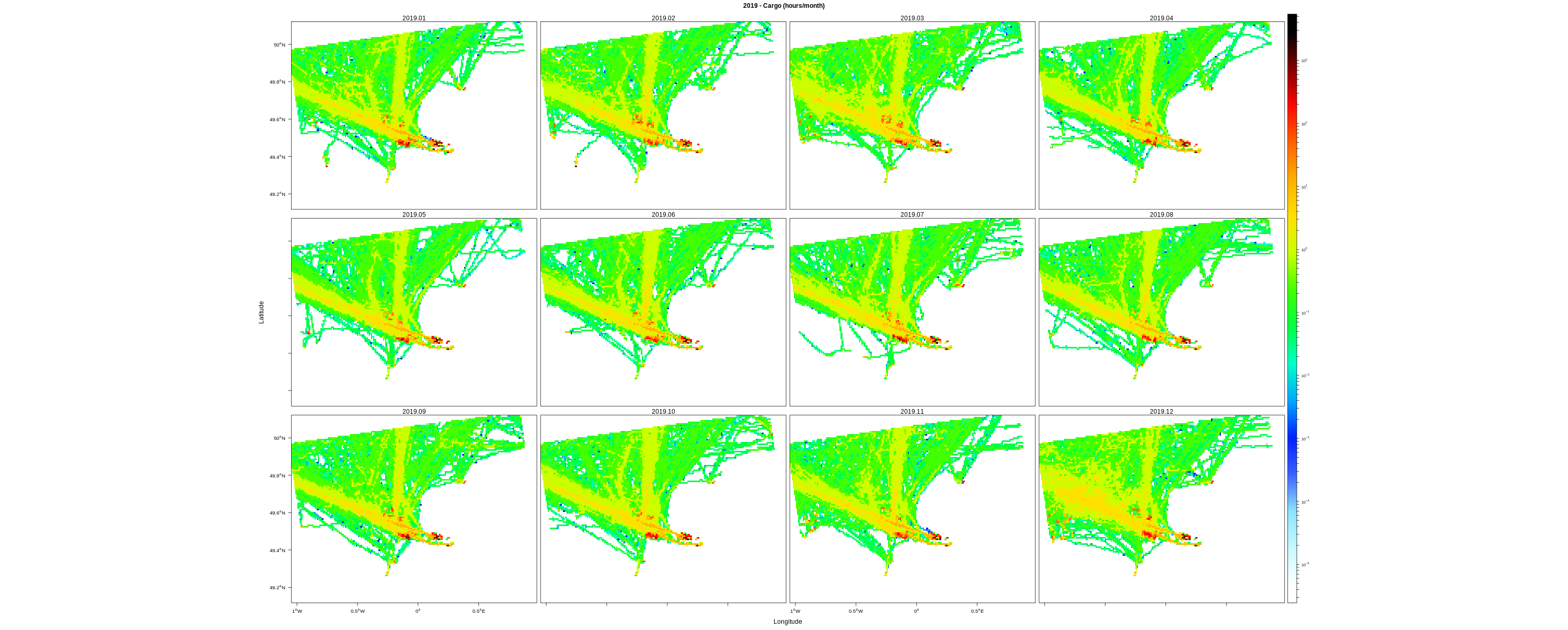 EMODnet Vessel Density maps were created by Cogea in 2019 in the framework of EMODnet Human Activities, an initiative funded by the EU Commission. The maps are based on AIS data purchased by Collecte Localisation Satellites (CLS) and ORBCOMM. The maps show shipping density in 1km*1km cells of a grid covering all EU waters (and some neighbouring areas). Density is expressed as hours per square kilometre per month. The following ship types are available:0 Other, 1 Fishing, 2 Service, 3 Dredging or underwater ops, 4 Sailing, 5 Pleasure Craft, 6 High speed craft, 7 Tug and towing, 8 Passenger, 9 Cargo, 10 Tanker, 11 Military and Law Enforcement, 12 Unknown and All ship types. Data are available by month of year. Yearly averages are also available.
