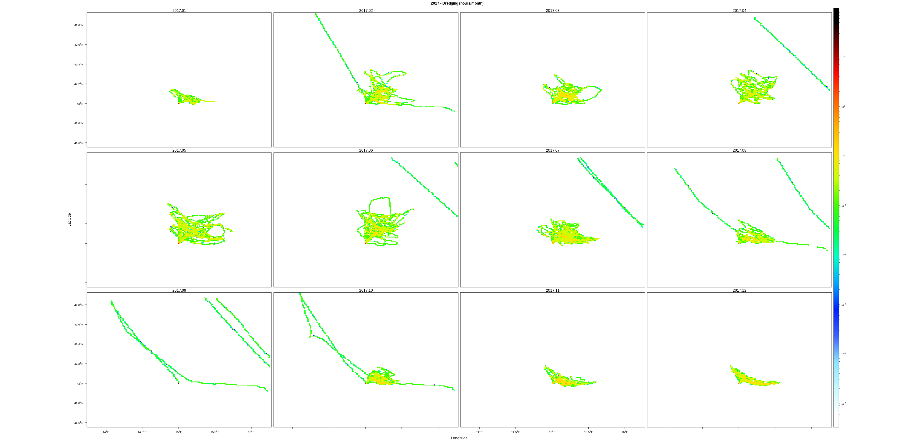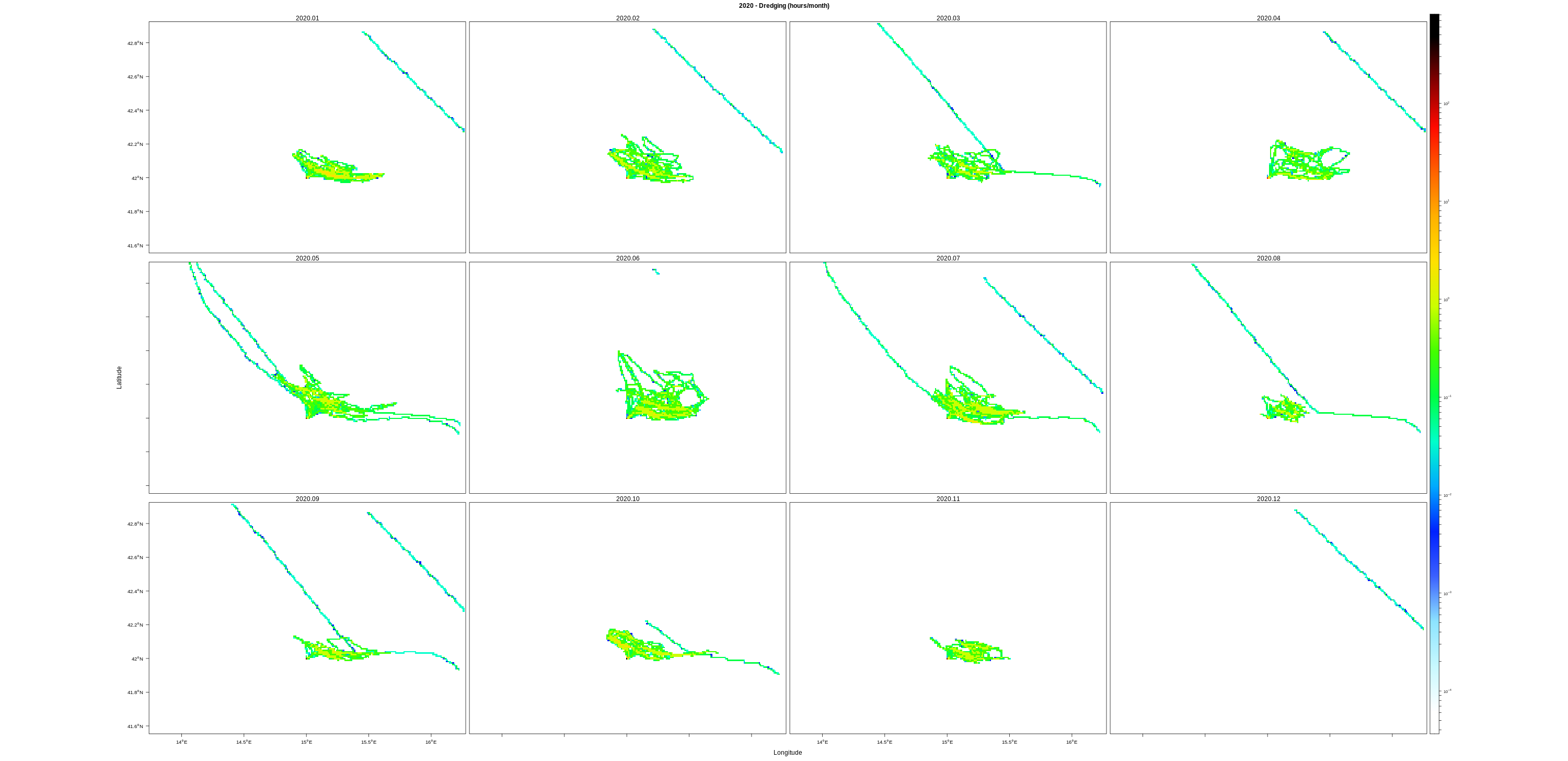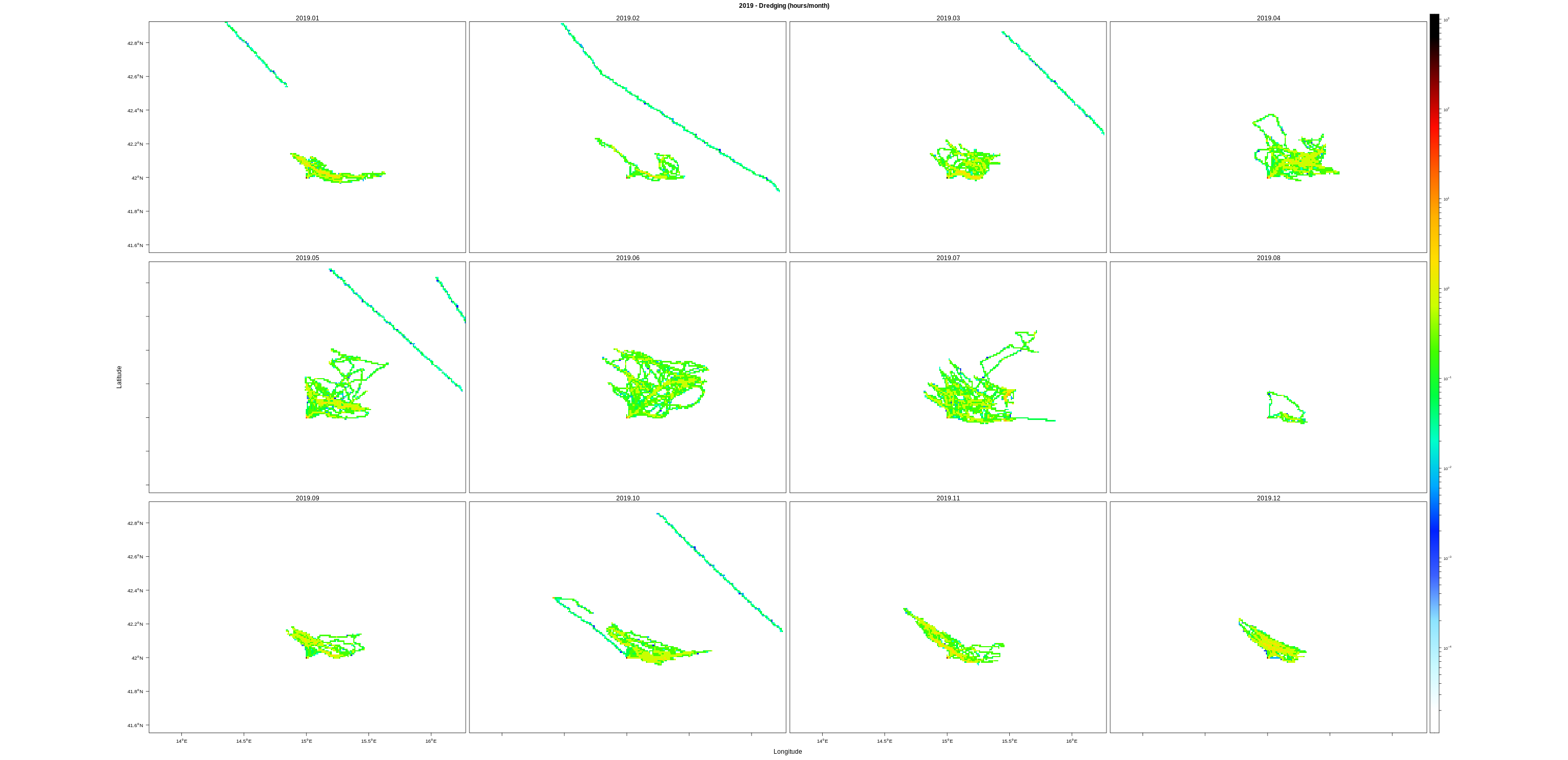 EMODnet Vessel Density maps were created by Cogea in 2019 in the framework of EMODnet Human Activities, an initiative funded by the EU Commission. The maps are based on AIS data purchased by Collecte Localisation Satellites (CLS) and ORBCOMM. The maps show shipping density in 1km*1km cells of a grid covering all EU waters (and some neighbouring areas). Density is expressed as hours per square kilometre per month. The following ship types are available:0 Other, 1 Fishing, 2 Service, 3 Dredging or underwater ops, 4 Sailing, 5 Pleasure Craft, 6 High speed craft, 7 Tug and towing, 8 Passenger, 9 Cargo, 10 Tanker, 11 Military and Law Enforcement, 12 Unknown and All ship types. Data are available by month of year. Yearly averages are also available.