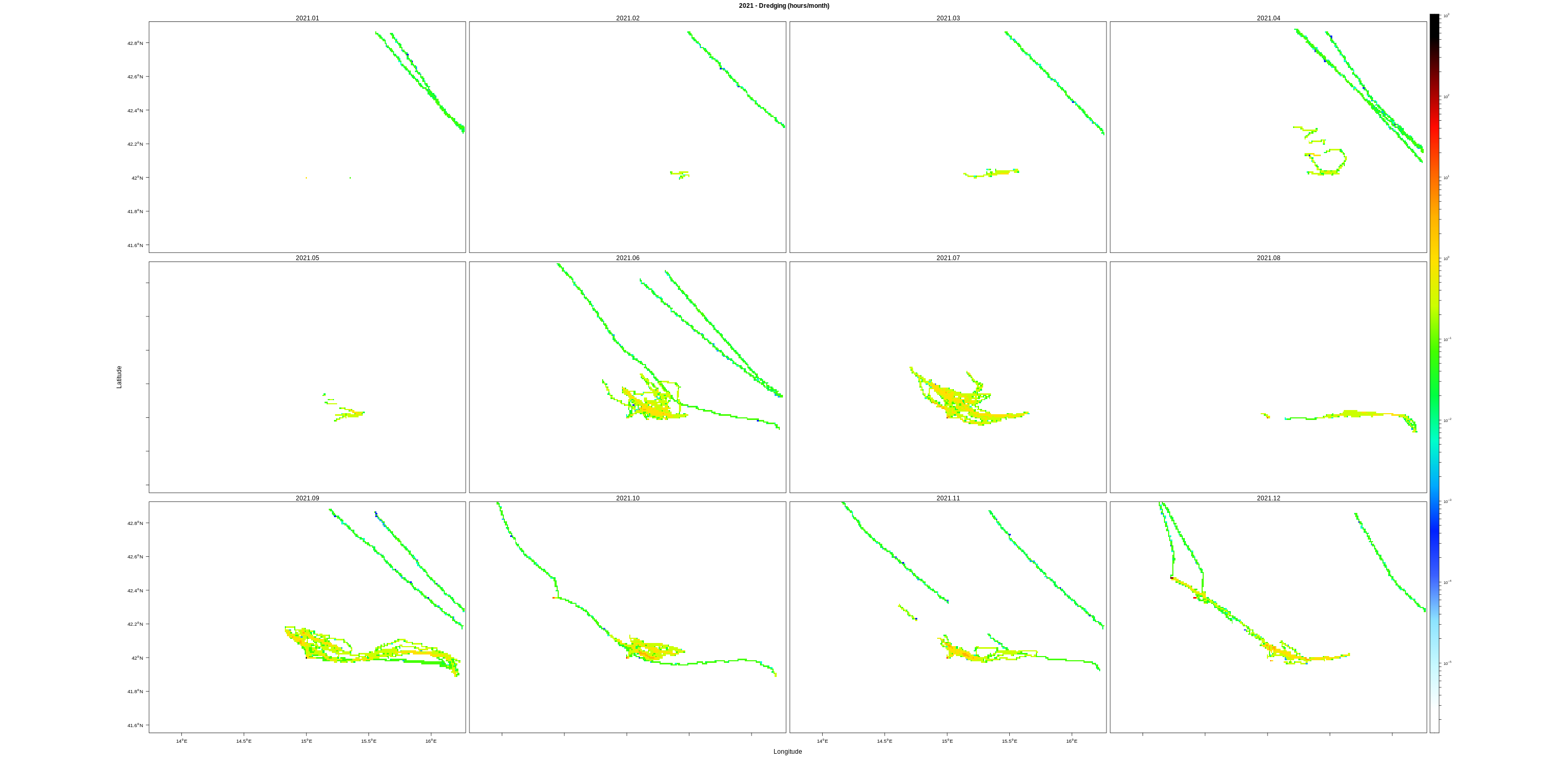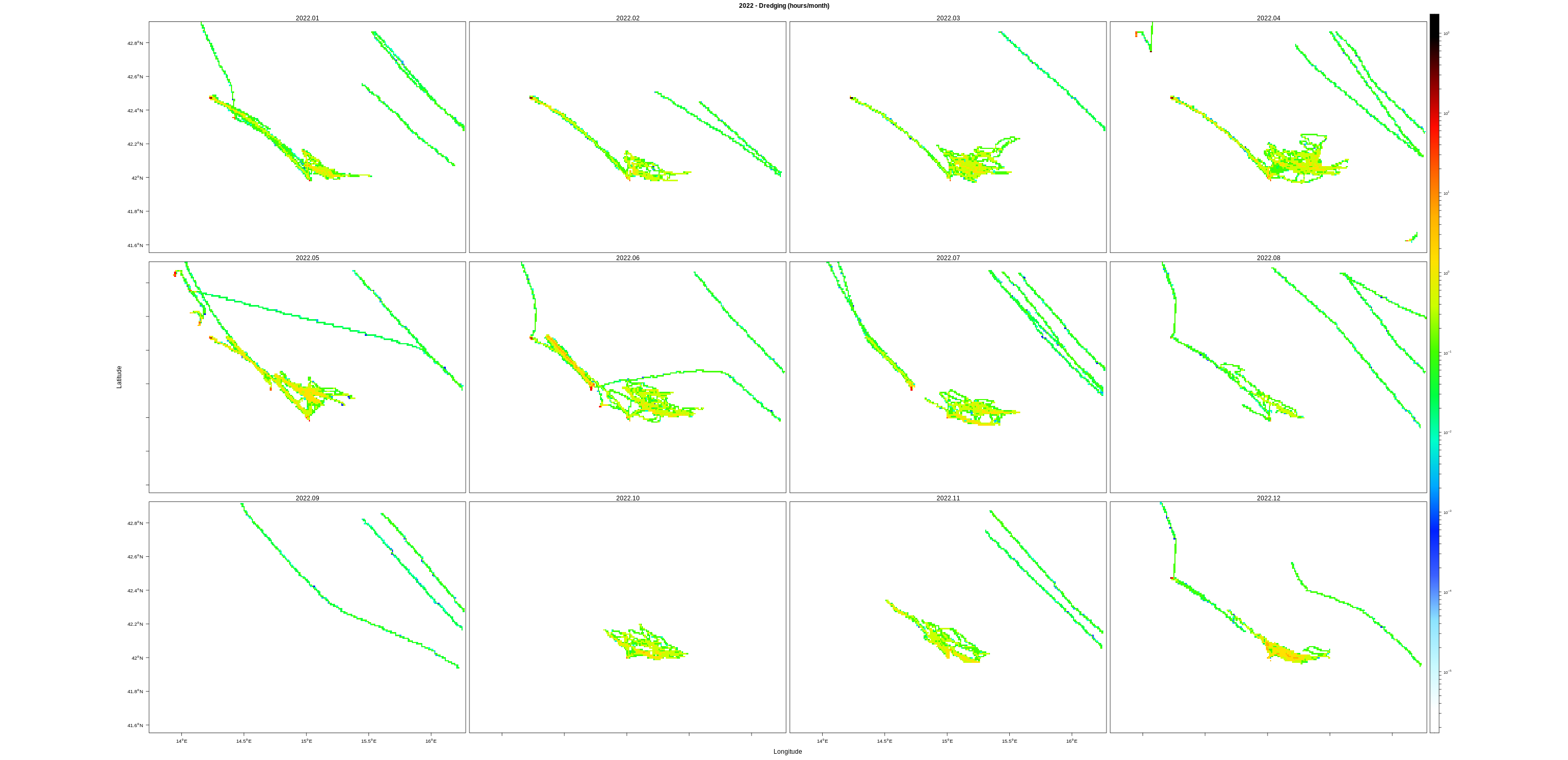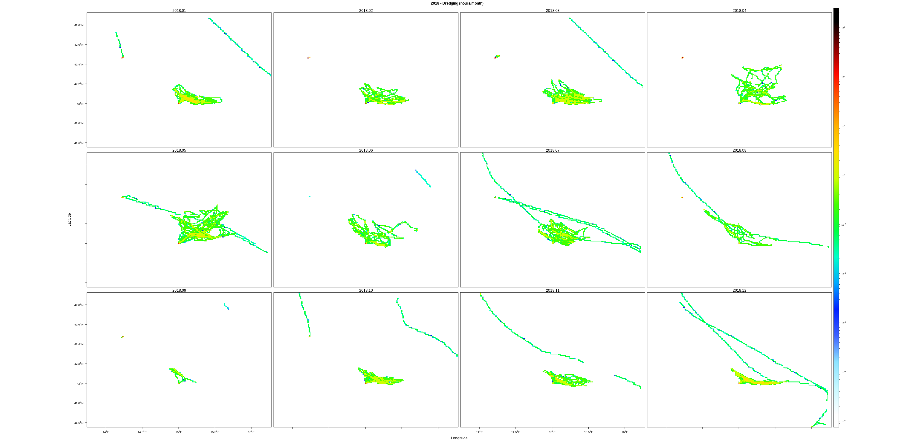 EMODnet Vessel Density maps were created by Cogea in 2019 in the framework of EMODnet Human Activities, an initiative funded by the EU Commission. The maps are based on AIS data purchased by Collecte Localisation Satellites (CLS) and ORBCOMM. The maps show shipping density in 1km*1km cells of a grid covering all EU waters (and some neighbouring areas). Density is expressed as hours per square kilometre per month. The following ship types are available:0 Other, 1 Fishing, 2 Service, 3 Dredging or underwater ops, 4 Sailing, 5 Pleasure Craft, 6 High speed craft, 7 Tug and towing, 8 Passenger, 9 Cargo, 10 Tanker, 11 Military and Law Enforcement, 12 Unknown and All ship types. Data are available by month of year. Yearly averages are also available.
