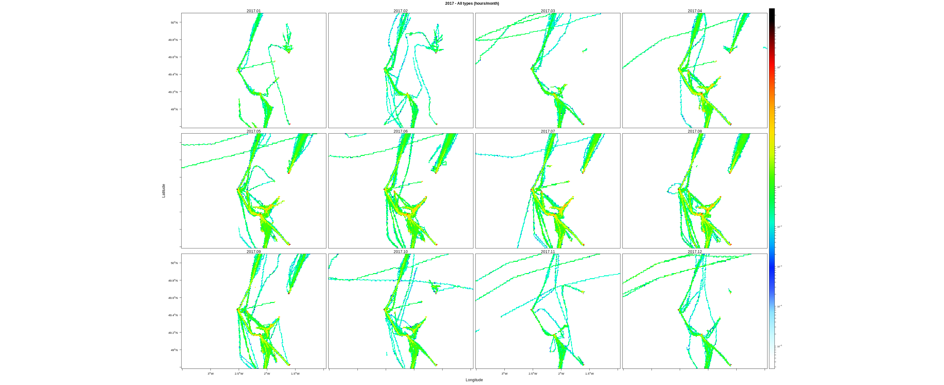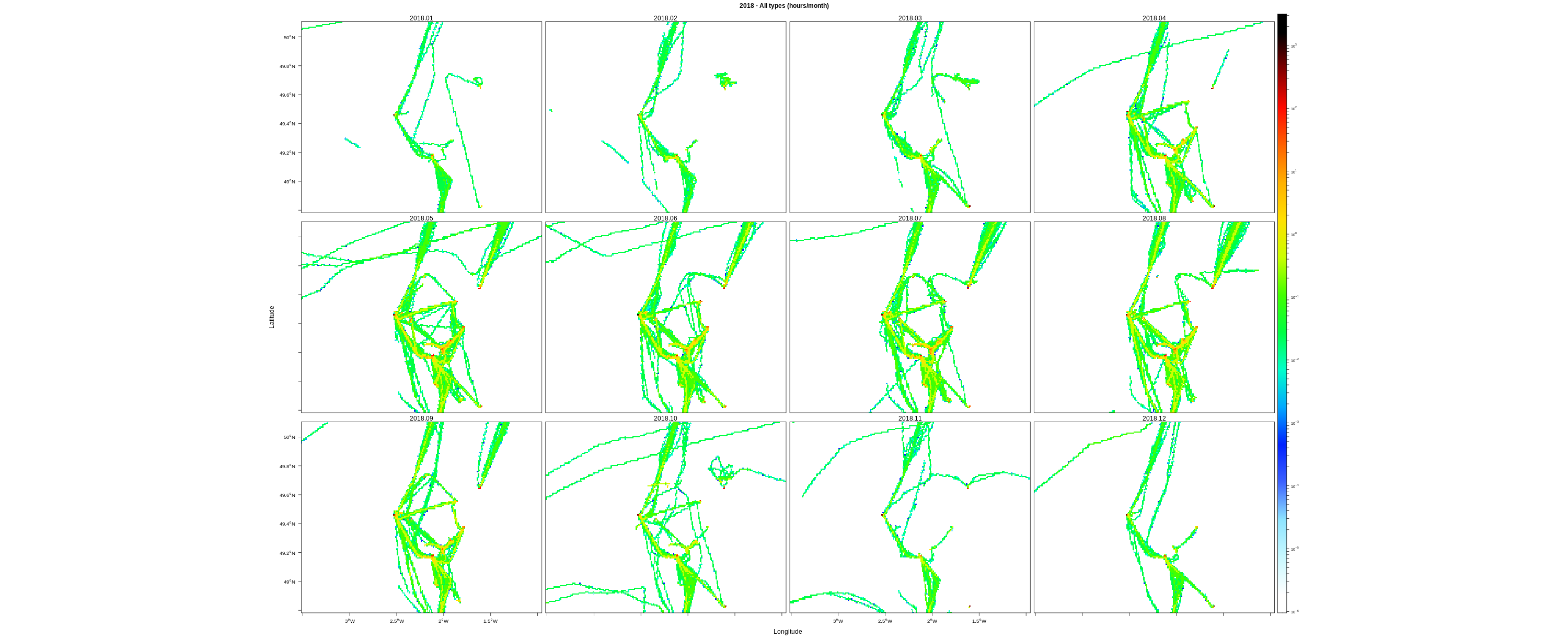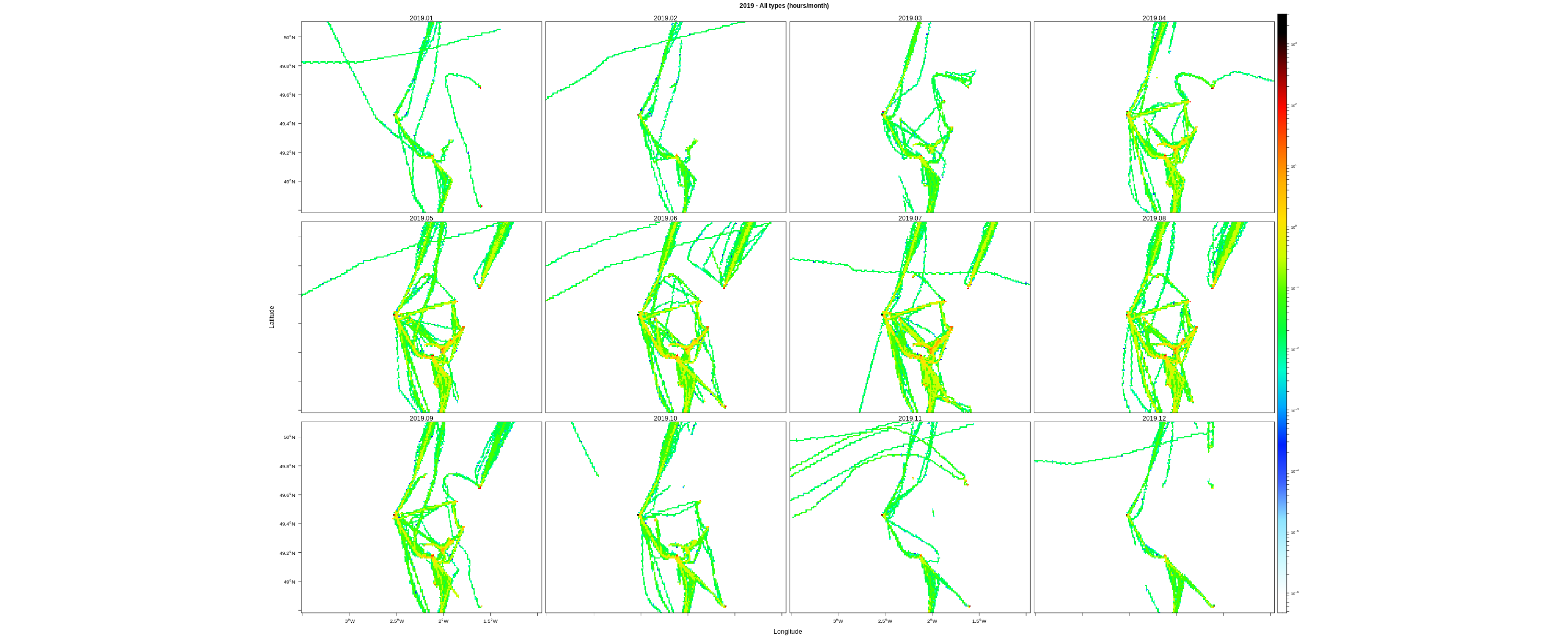 EMODnet Vessel Density maps were created by Cogea in 2019 in the framework of EMODnet Human Activities, an initiative funded by the EU Commission. The maps are based on AIS data purchased by Collecte Localisation Satellites (CLS) and ORBCOMM. The maps show shipping density in 1km*1km cells of a grid covering all EU waters (and some neighbouring areas). Density is expressed as hours per square kilometre per month. The following ship types are available:0 Other, 1 Fishing, 2 Service, 3 Dredging or underwater ops, 4 Sailing, 5 Pleasure Craft, 6 High speed craft, 7 Tug and towing, 8 Passenger, 9 Cargo, 10 Tanker, 11 Military and Law Enforcement, 12 Unknown and All ship types. Data are available by month of year. Yearly averages are also available.