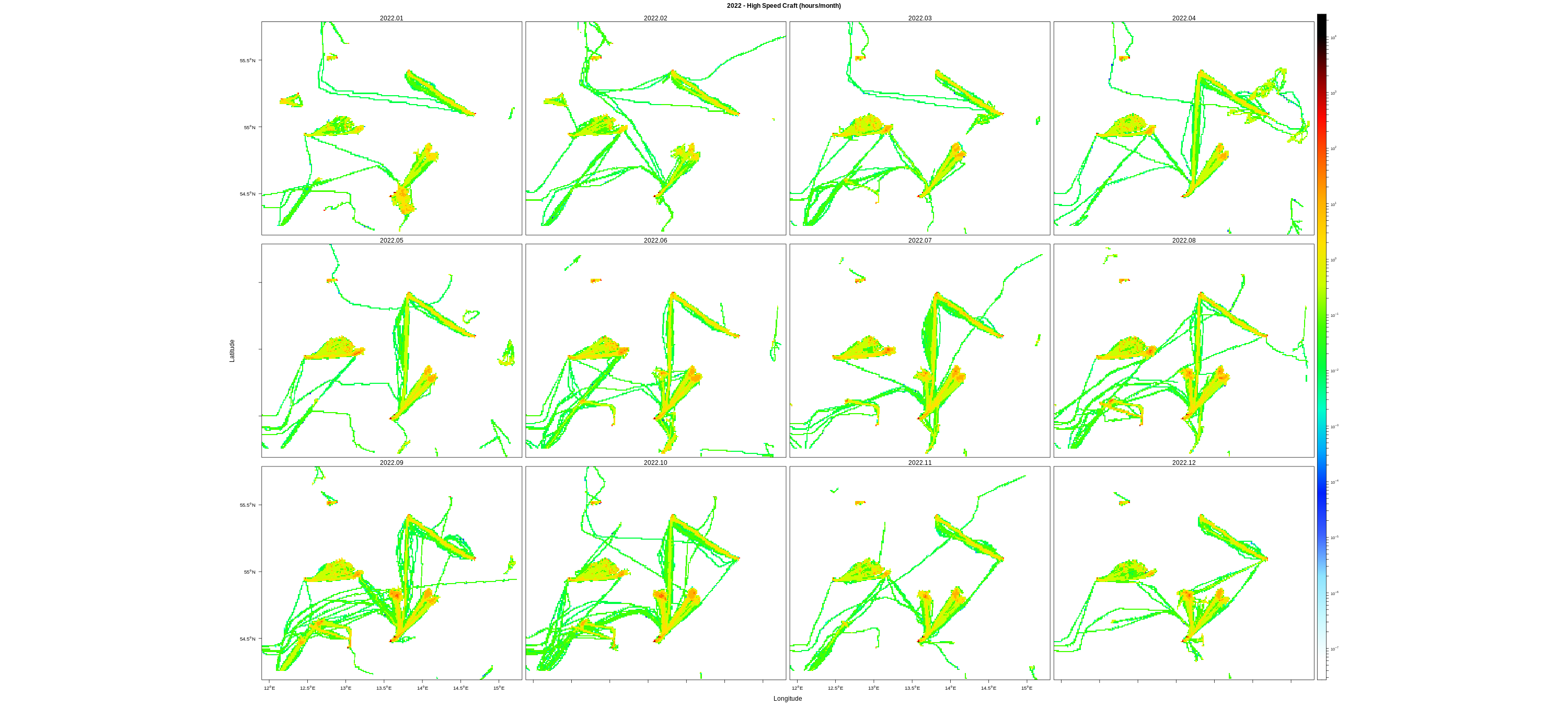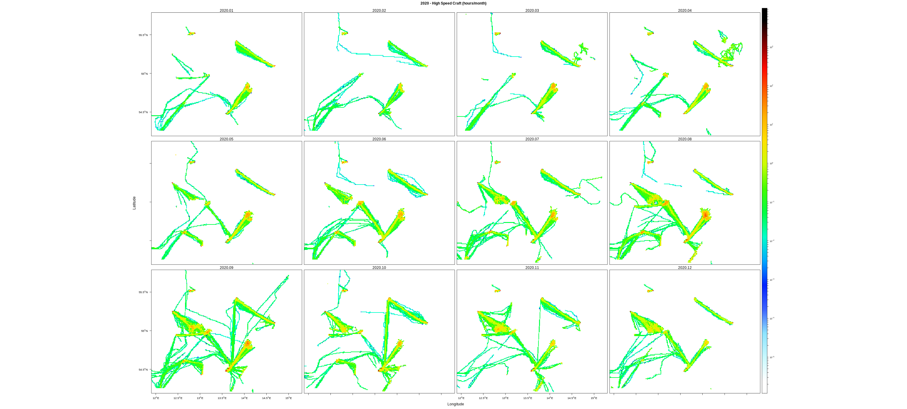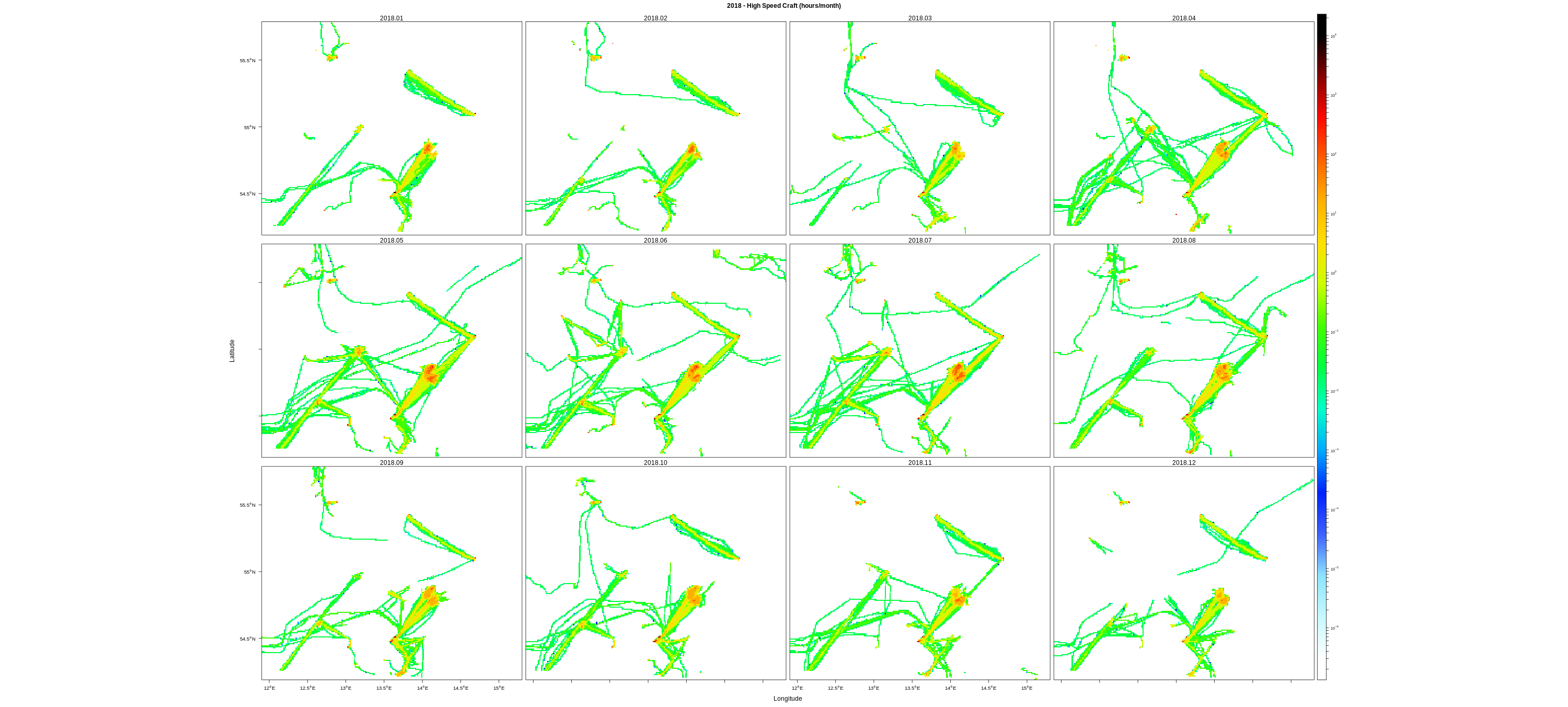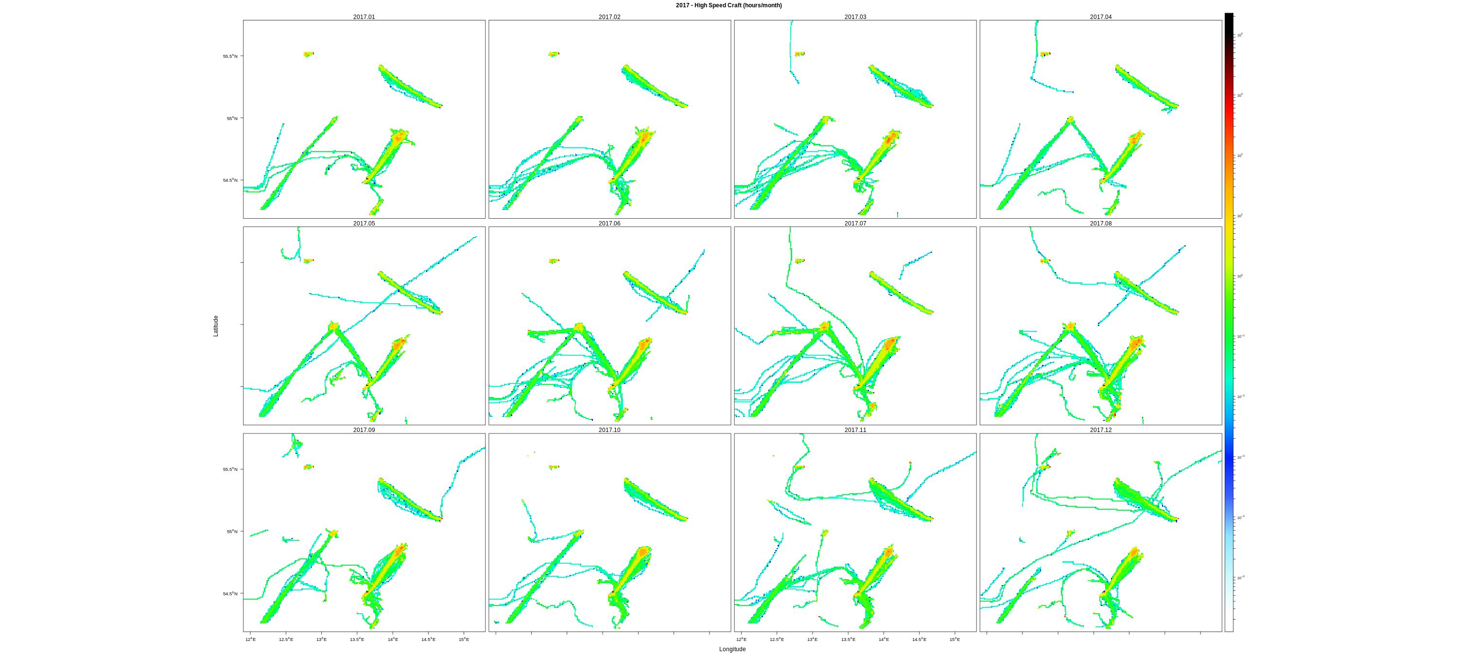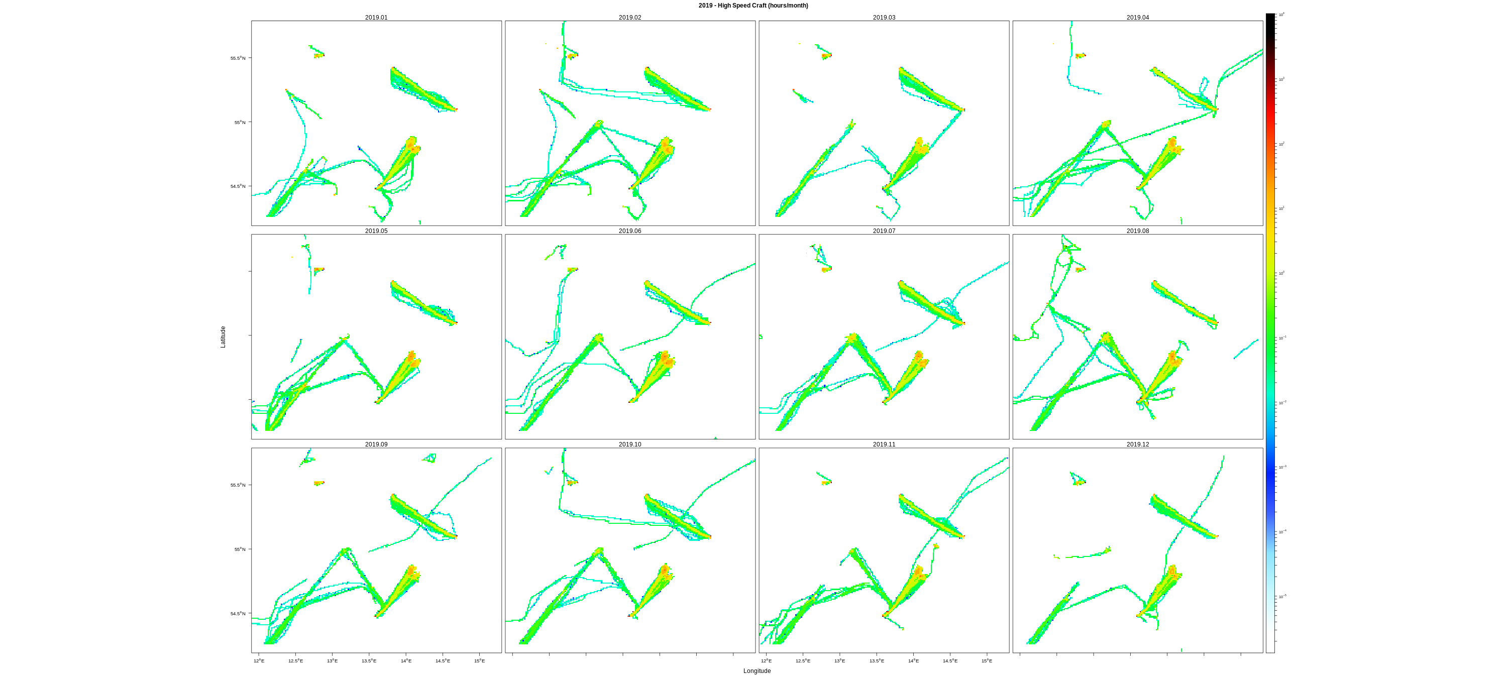 EMODnet Vessel Density maps were created by Cogea in 2019 in the framework of EMODnet Human Activities, an initiative funded by the EU Commission. The maps are based on AIS data purchased by Collecte Localisation Satellites (CLS) and ORBCOMM. The maps show shipping density in 1km*1km cells of a grid covering all EU waters (and some neighbouring areas). Density is expressed as hours per square kilometre per month. The following ship types are available:0 Other, 1 Fishing, 2 Service, 3 Dredging or underwater ops, 4 Sailing, 5 Pleasure Craft, 6 High speed craft, 7 Tug and towing, 8 Passenger, 9 Cargo, 10 Tanker, 11 Military and Law Enforcement, 12 Unknown and All ship types. Data are available by month of year. Yearly averages are also available.