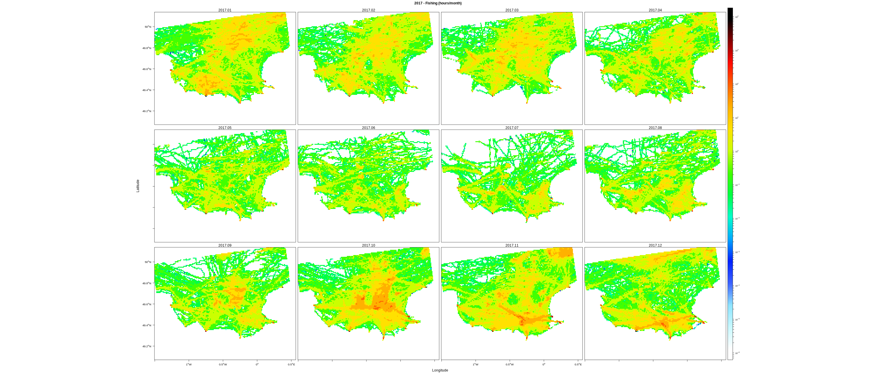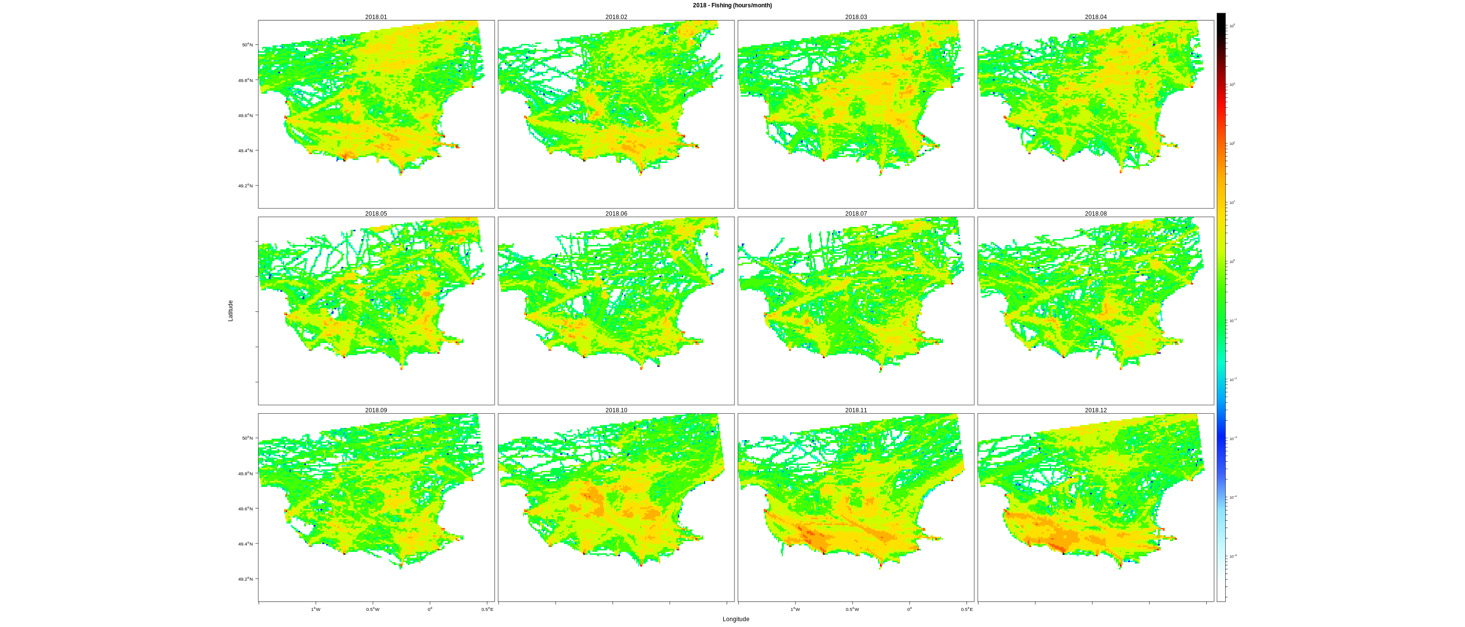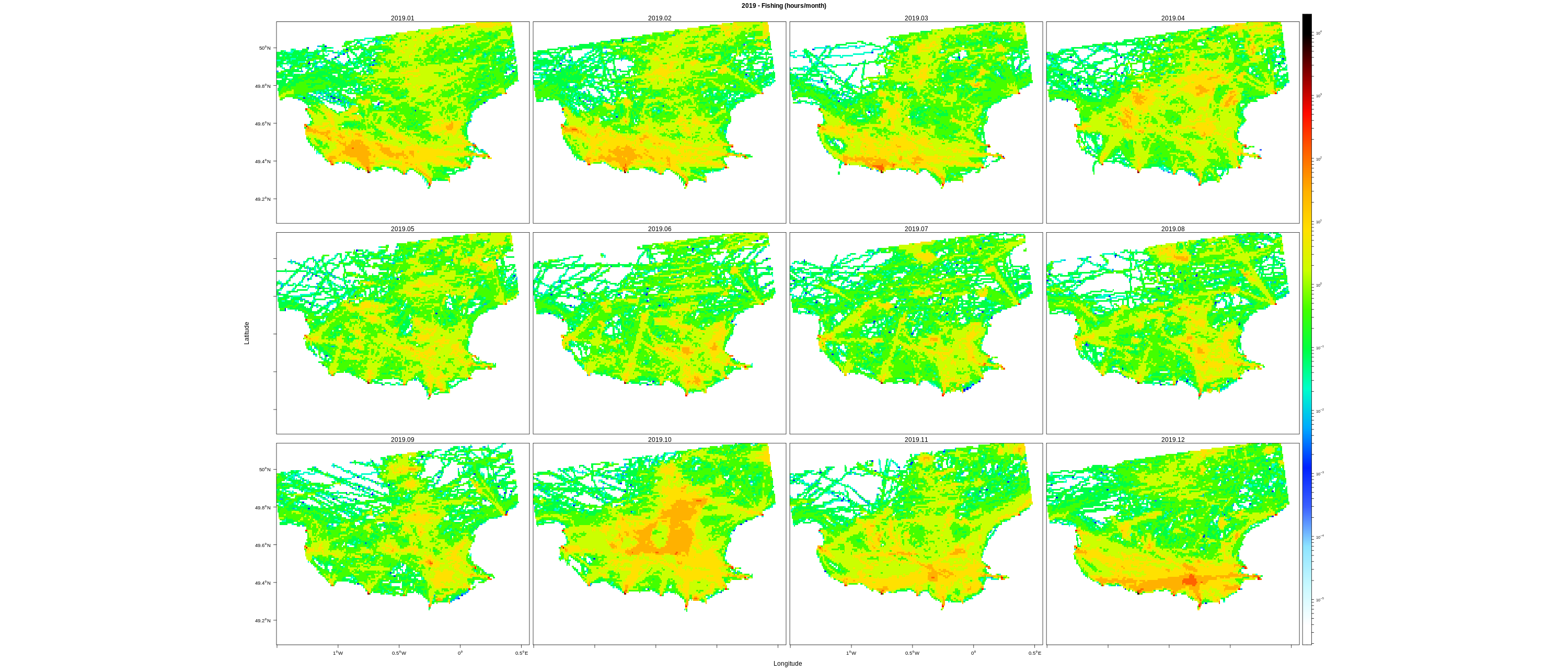 EMODnet Vessel Density maps were created by Cogea in 2019 in the framework of EMODnet Human Activities, an initiative funded by the EU Commission. The maps are based on AIS data purchased by Collecte Localisation Satellites (CLS) and ORBCOMM. The maps show shipping density in 1km*1km cells of a grid covering all EU waters (and some neighbouring areas). Density is expressed as hours per square kilometre per month. The following ship types are available:0 Other, 1 Fishing, 2 Service, 3 Dredging or underwater ops, 4 Sailing, 5 Pleasure Craft, 6 High speed craft, 7 Tug and towing, 8 Passenger, 9 Cargo, 10 Tanker, 11 Military and Law Enforcement, 12 Unknown and All ship types. Data are available by month of year. Yearly averages are also available.