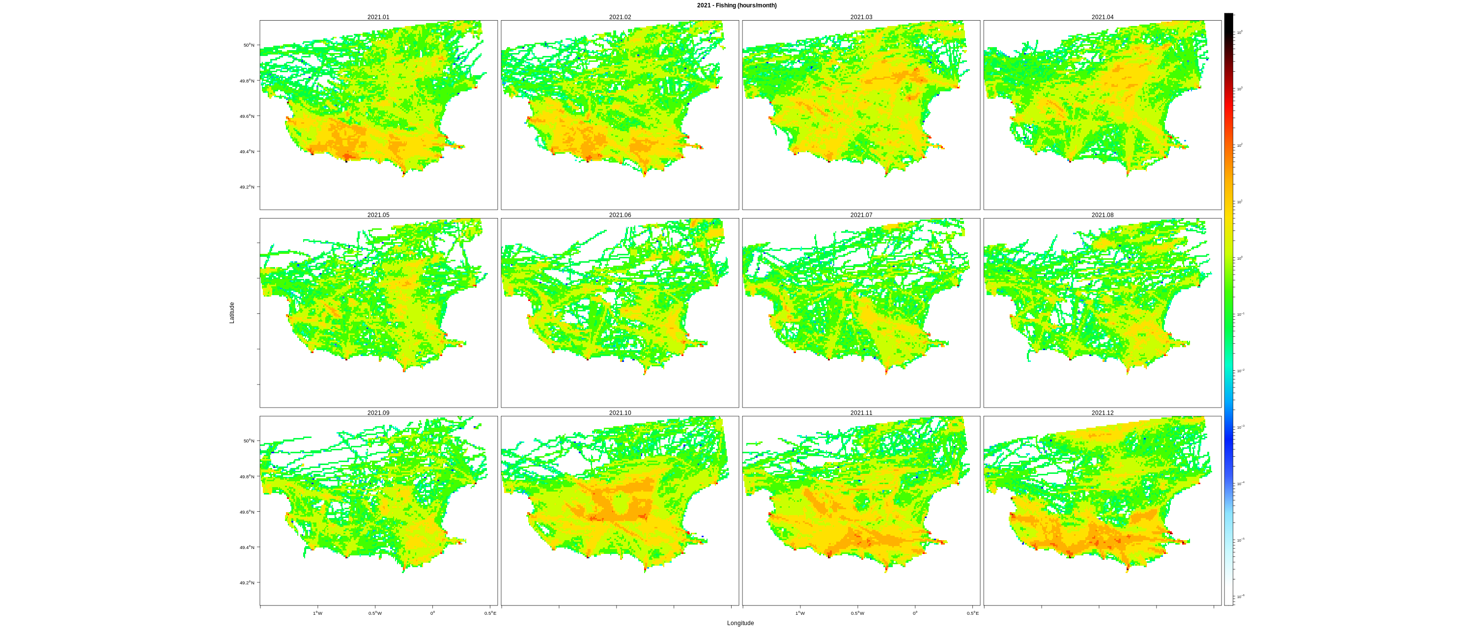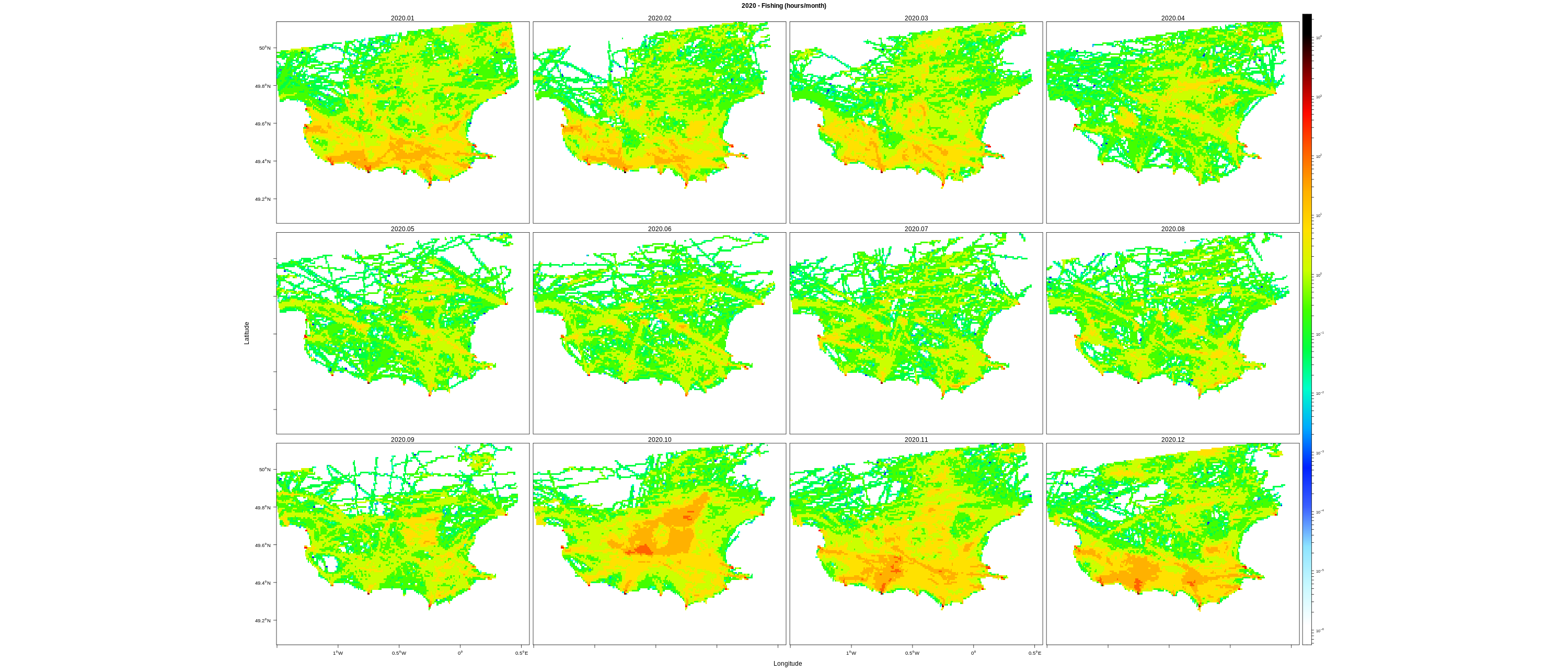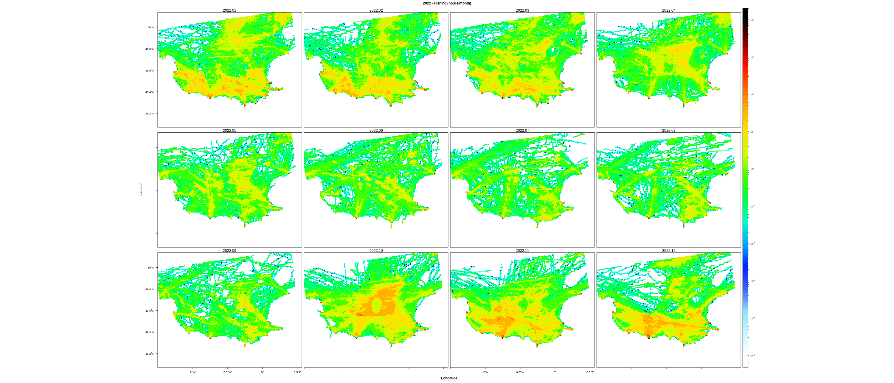 EMODnet Vessel Density maps were created by Cogea in 2019 in the framework of EMODnet Human Activities, an initiative funded by the EU Commission. The maps are based on AIS data purchased by Collecte Localisation Satellites (CLS) and ORBCOMM. The maps show shipping density in 1km*1km cells of a grid covering all EU waters (and some neighbouring areas). Density is expressed as hours per square kilometre per month. The following ship types are available:0 Other, 1 Fishing, 2 Service, 3 Dredging or underwater ops, 4 Sailing, 5 Pleasure Craft, 6 High speed craft, 7 Tug and towing, 8 Passenger, 9 Cargo, 10 Tanker, 11 Military and Law Enforcement, 12 Unknown and All ship types. Data are available by month of year. Yearly averages are also available.