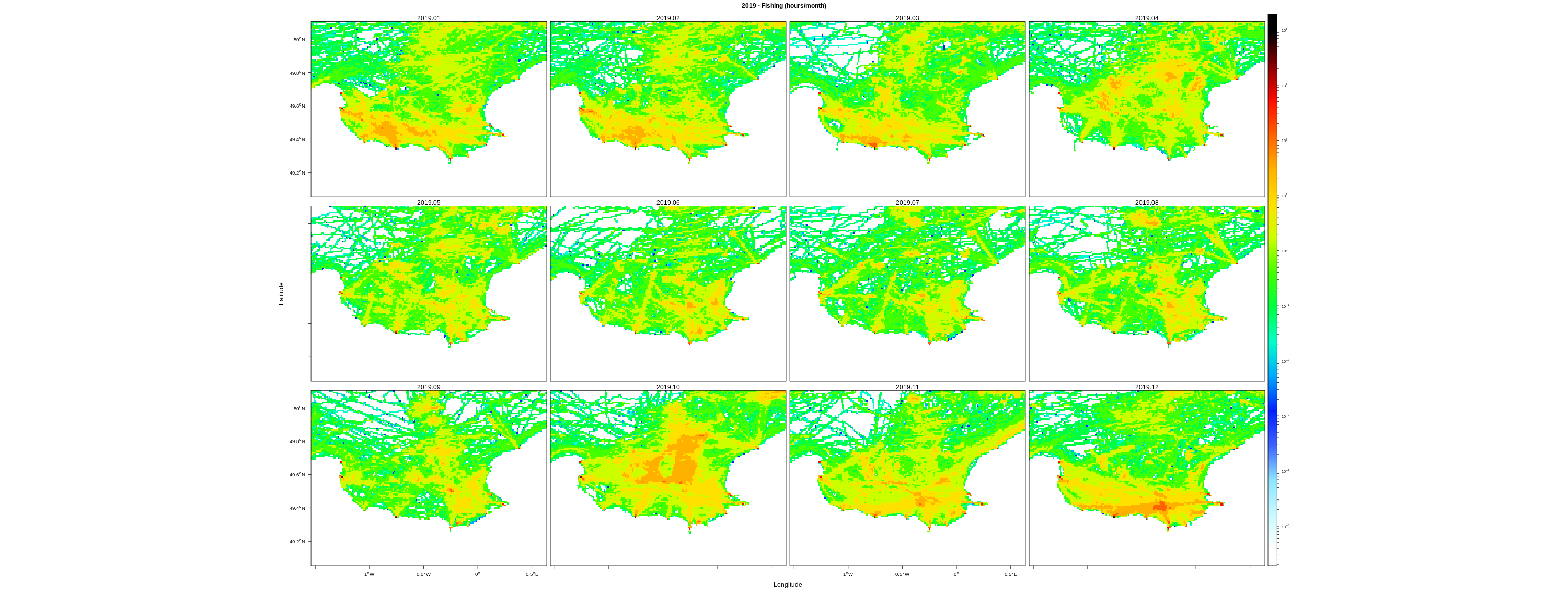 EMODnet Vessel Density maps were created by Cogea in 2019 in the framework of EMODnet Human Activities, an initiative funded by the EU Commission. The maps are based on AIS data purchased by Collecte Localisation Satellites (CLS) and ORBCOMM. The maps show shipping density in 1km*1km cells of a grid covering all EU waters (and some neighbouring areas). Density is expressed as hours per square kilometre per month. The following ship types are available:0 Other, 1 Fishing, 2 Service, 3 Dredging or underwater ops, 4 Sailing, 5 Pleasure Craft, 6 High speed craft, 7 Tug and towing, 8 Passenger, 9 Cargo, 10 Tanker, 11 Military and Law Enforcement, 12 Unknown and All ship types. Data are available by month of year. Yearly averages are also available.