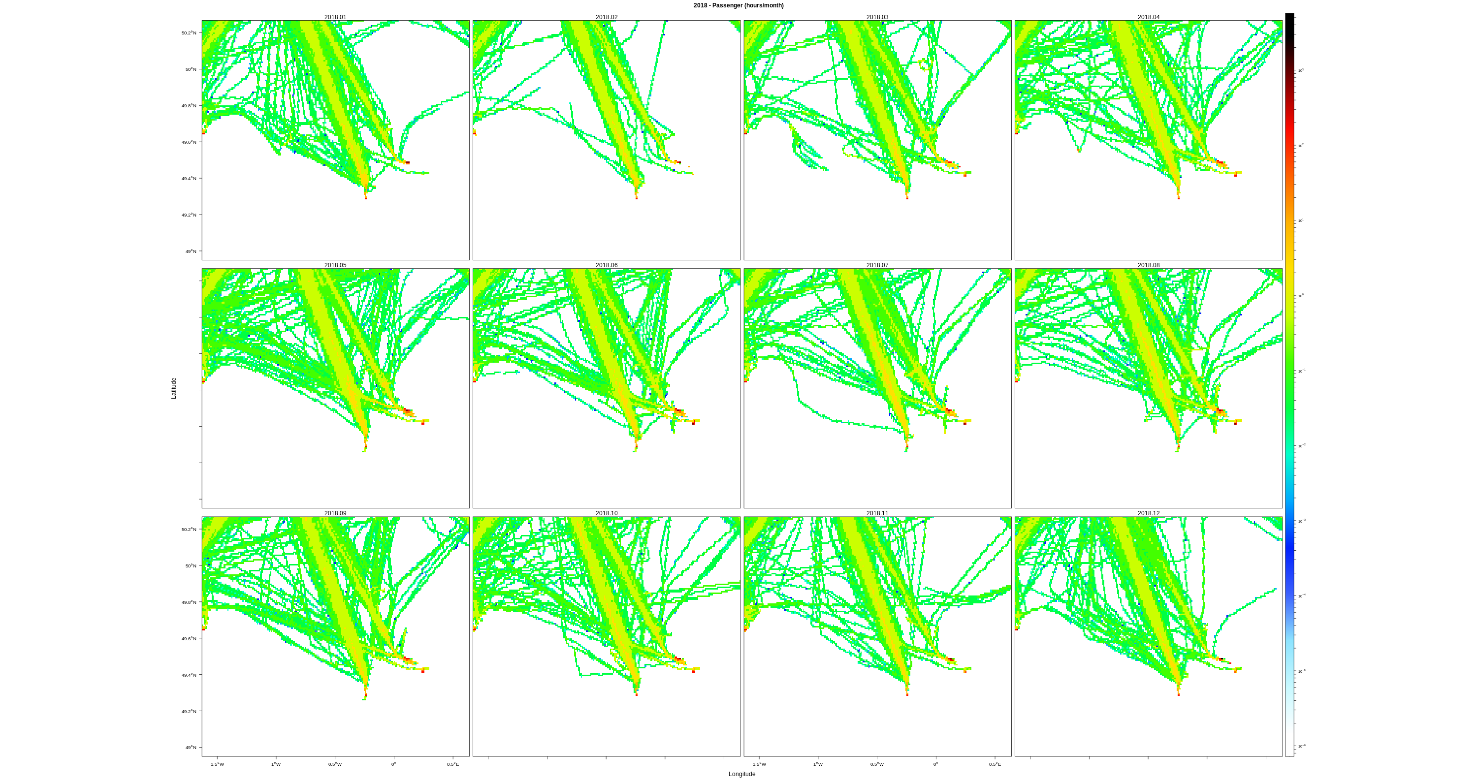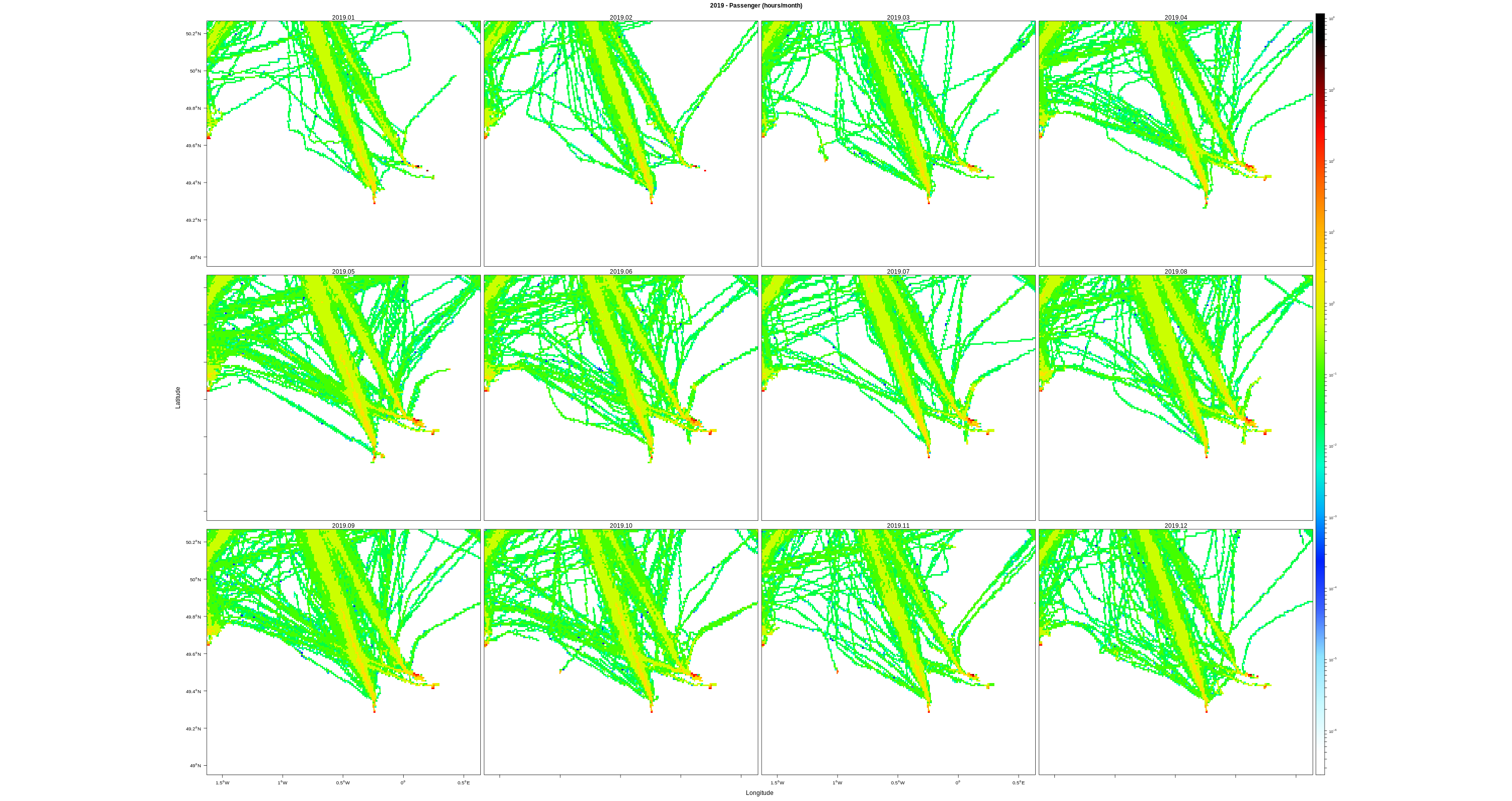 EMODnet Vessel Density maps were created by Cogea in 2019 in the framework of EMODnet Human Activities, an initiative funded by the EU Commission. The maps are based on AIS data purchased by Collecte Localisation Satellites (CLS) and ORBCOMM. The maps show shipping density in 1km*1km cells of a grid covering all EU waters (and some neighbouring areas). Density is expressed as hours per square kilometre per month. The following ship types are available:0 Other, 1 Fishing, 2 Service, 3 Dredging or underwater ops, 4 Sailing, 5 Pleasure Craft, 6 High speed craft, 7 Tug and towing, 8 Passenger, 9 Cargo, 10 Tanker, 11 Military and Law Enforcement, 12 Unknown and All ship types. Data are available by month of year. Yearly averages are also available.