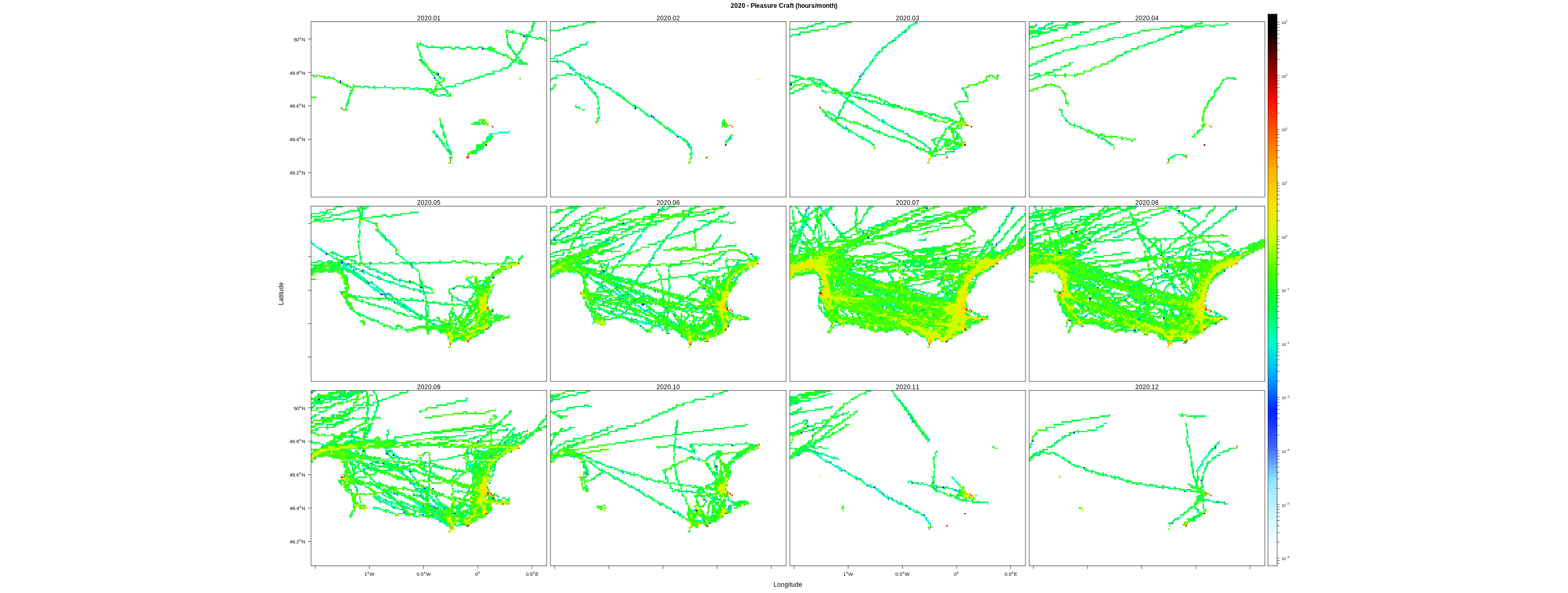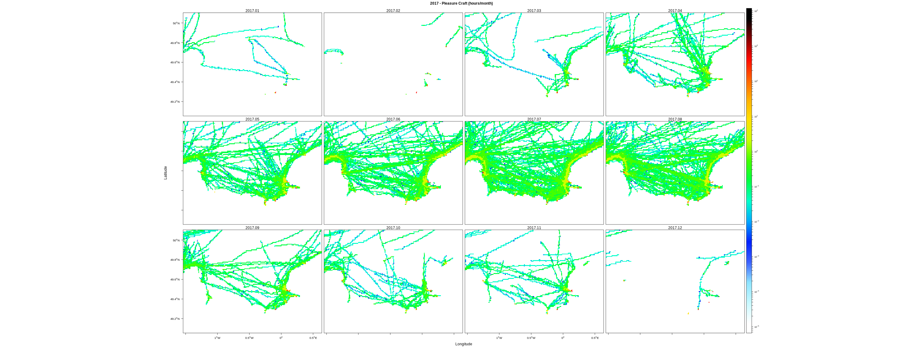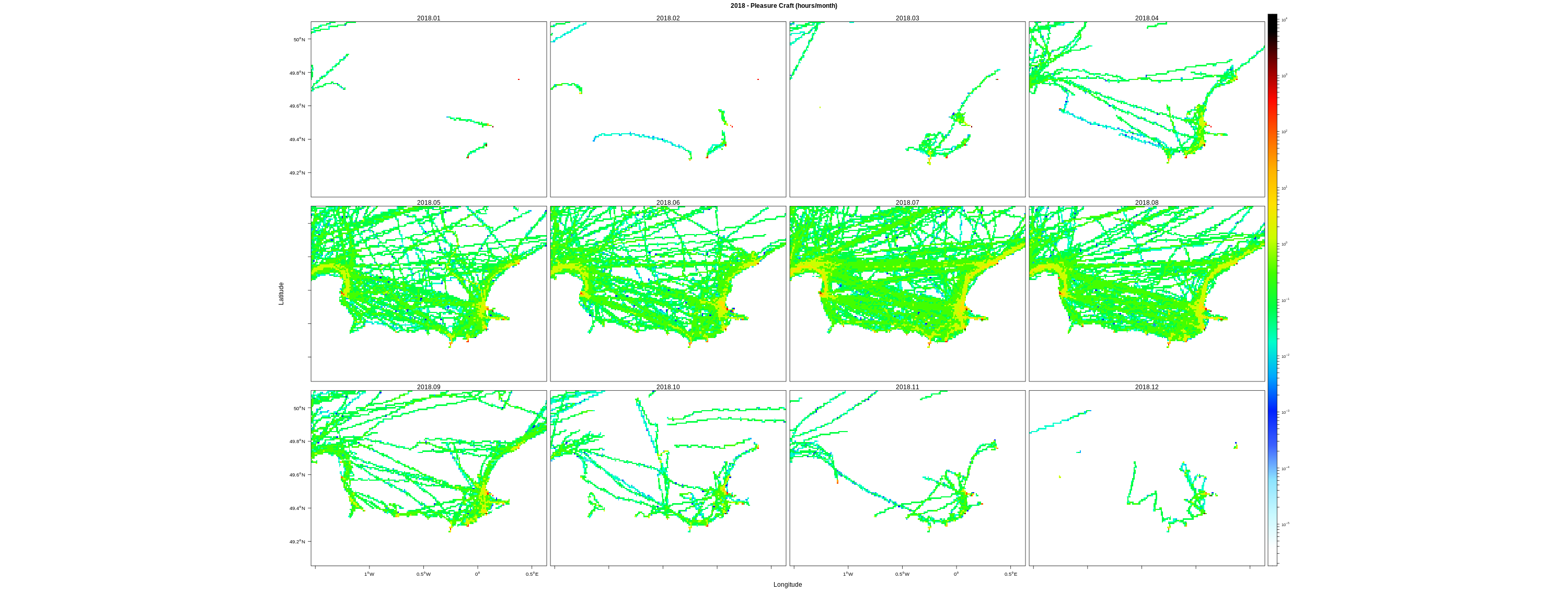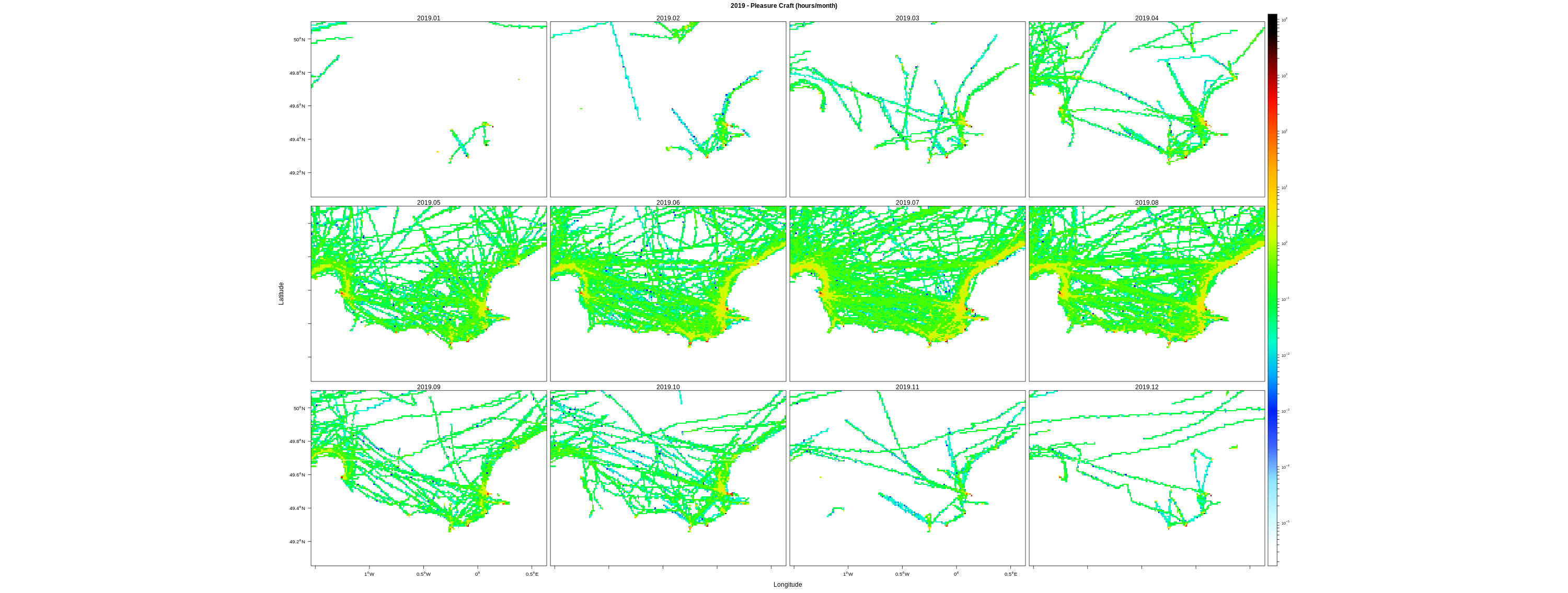 EMODnet Vessel Density maps were created by Cogea in 2019 in the framework of EMODnet Human Activities, an initiative funded by the EU Commission. The maps are based on AIS data purchased by Collecte Localisation Satellites (CLS) and ORBCOMM. The maps show shipping density in 1km*1km cells of a grid covering all EU waters (and some neighbouring areas). Density is expressed as hours per square kilometre per month. The following ship types are available:0 Other, 1 Fishing, 2 Service, 3 Dredging or underwater ops, 4 Sailing, 5 Pleasure Craft, 6 High speed craft, 7 Tug and towing, 8 Passenger, 9 Cargo, 10 Tanker, 11 Military and Law Enforcement, 12 Unknown and All ship types. Data are available by month of year. Yearly averages are also available.