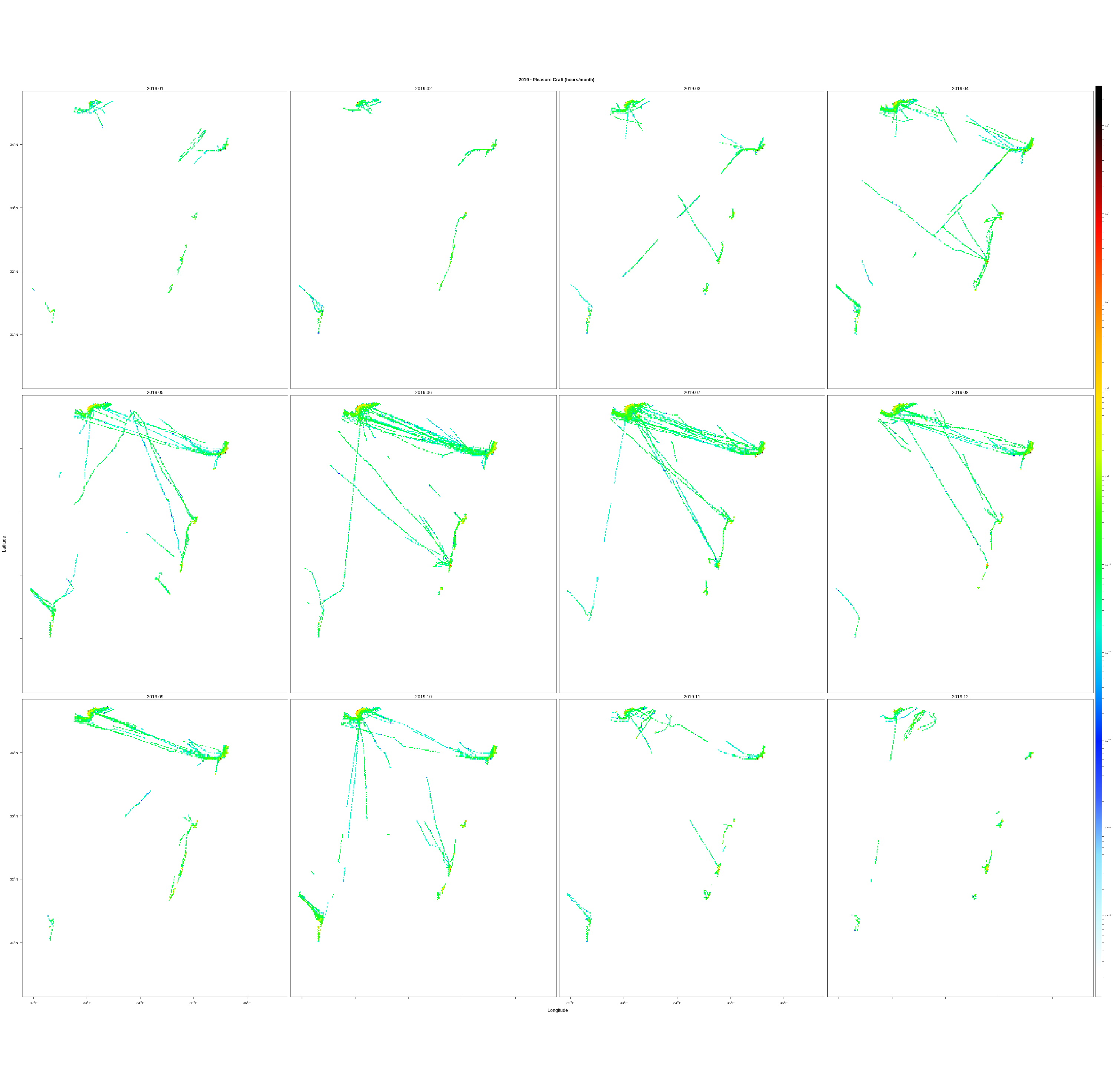 EMODnet Vessel Density maps were created by Cogea in 2019 in the framework of EMODnet Human Activities, an initiative funded by the EU Commission. The maps are based on AIS data purchased by Collecte Localisation Satellites (CLS) and ORBCOMM. The maps show shipping density in 1km*1km cells of a grid covering all EU waters (and some neighbouring areas). Density is expressed as hours per square kilometre per month. The following ship types are available:0 Other, 1 Fishing, 2 Service, 3 Dredging or underwater ops, 4 Sailing, 5 Pleasure Craft, 6 High speed craft, 7 Tug and towing, 8 Passenger, 9 Cargo, 10 Tanker, 11 Military and Law Enforcement, 12 Unknown and All ship types. Data are available by month of year. Yearly averages are also available.