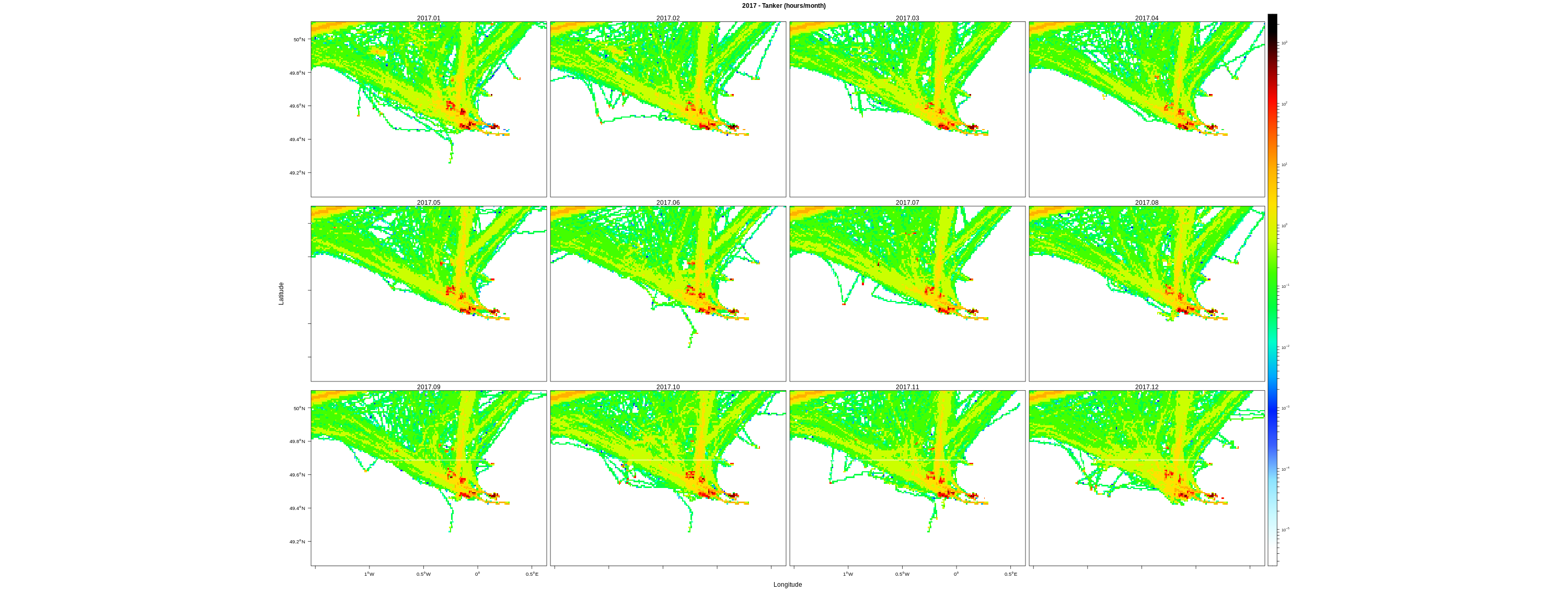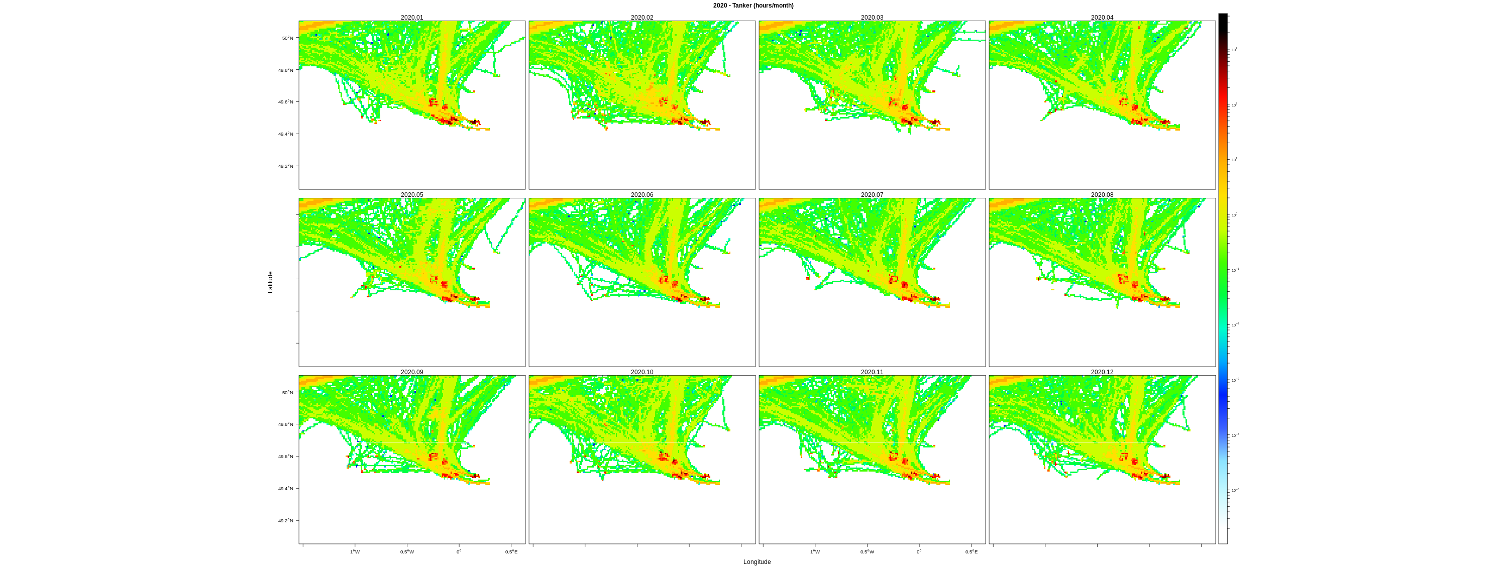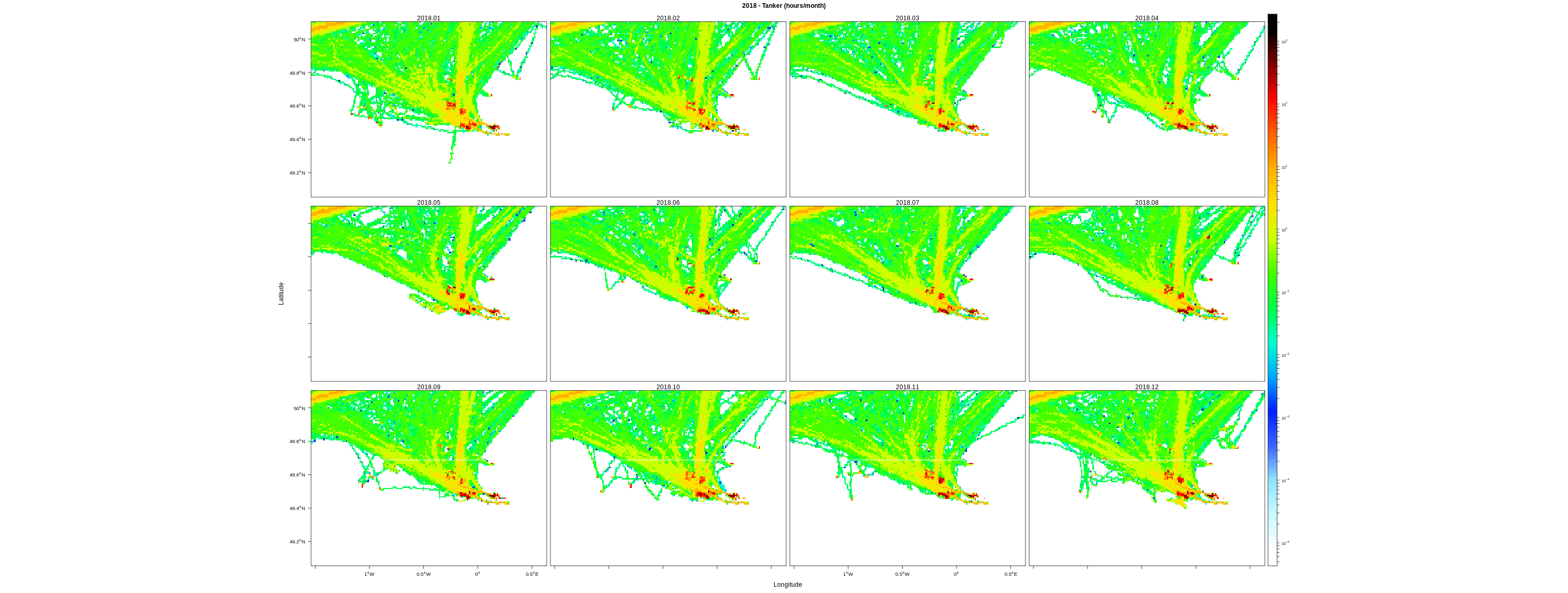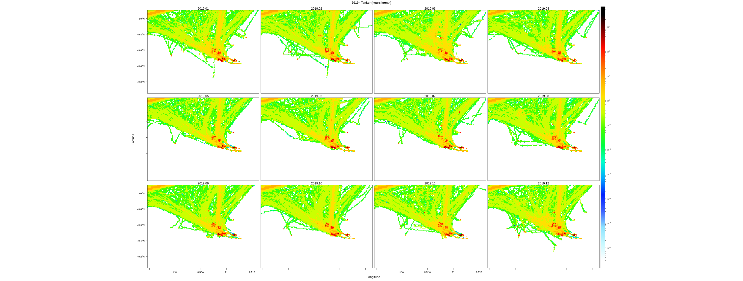 EMODnet Vessel Density maps were created by Cogea in 2019 in the framework of EMODnet Human Activities, an initiative funded by the EU Commission. The maps are based on AIS data purchased by Collecte Localisation Satellites (CLS) and ORBCOMM. The maps show shipping density in 1km*1km cells of a grid covering all EU waters (and some neighbouring areas). Density is expressed as hours per square kilometre per month. The following ship types are available:0 Other, 1 Fishing, 2 Service, 3 Dredging or underwater ops, 4 Sailing, 5 Pleasure Craft, 6 High speed craft, 7 Tug and towing, 8 Passenger, 9 Cargo, 10 Tanker, 11 Military and Law Enforcement, 12 Unknown and All ship types. Data are available by month of year. Yearly averages are also available.