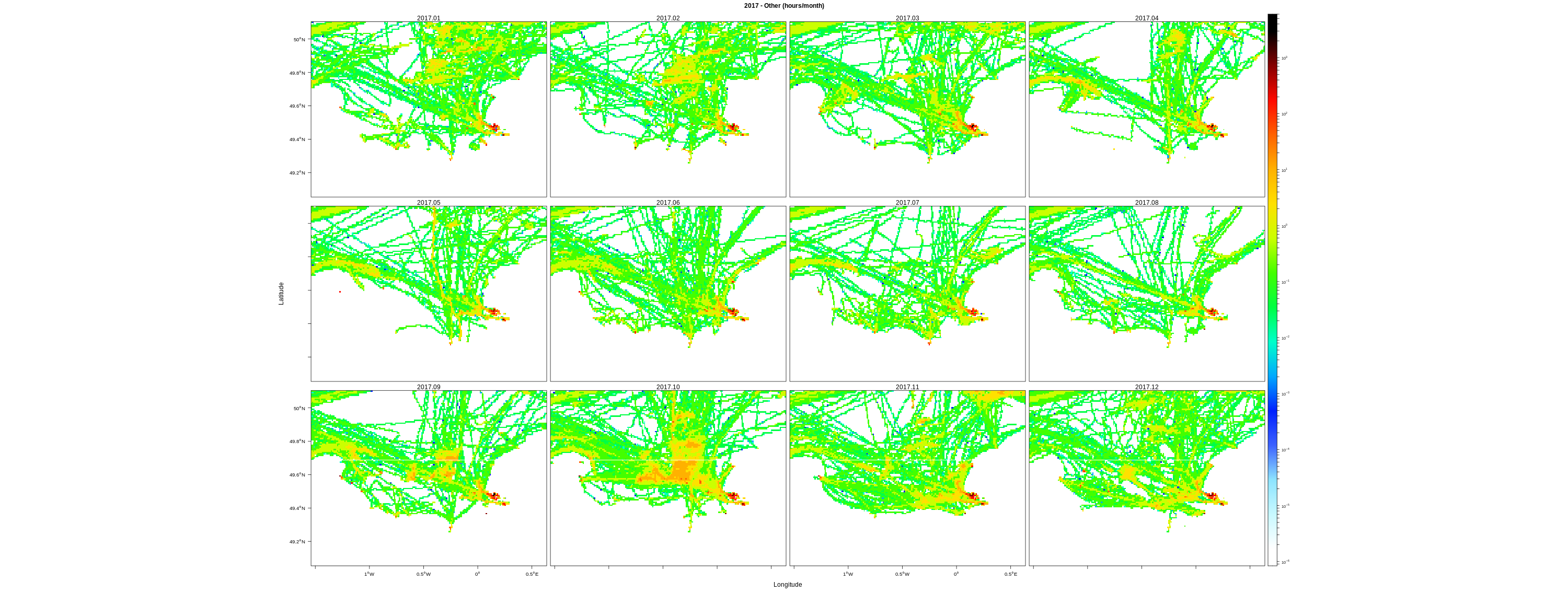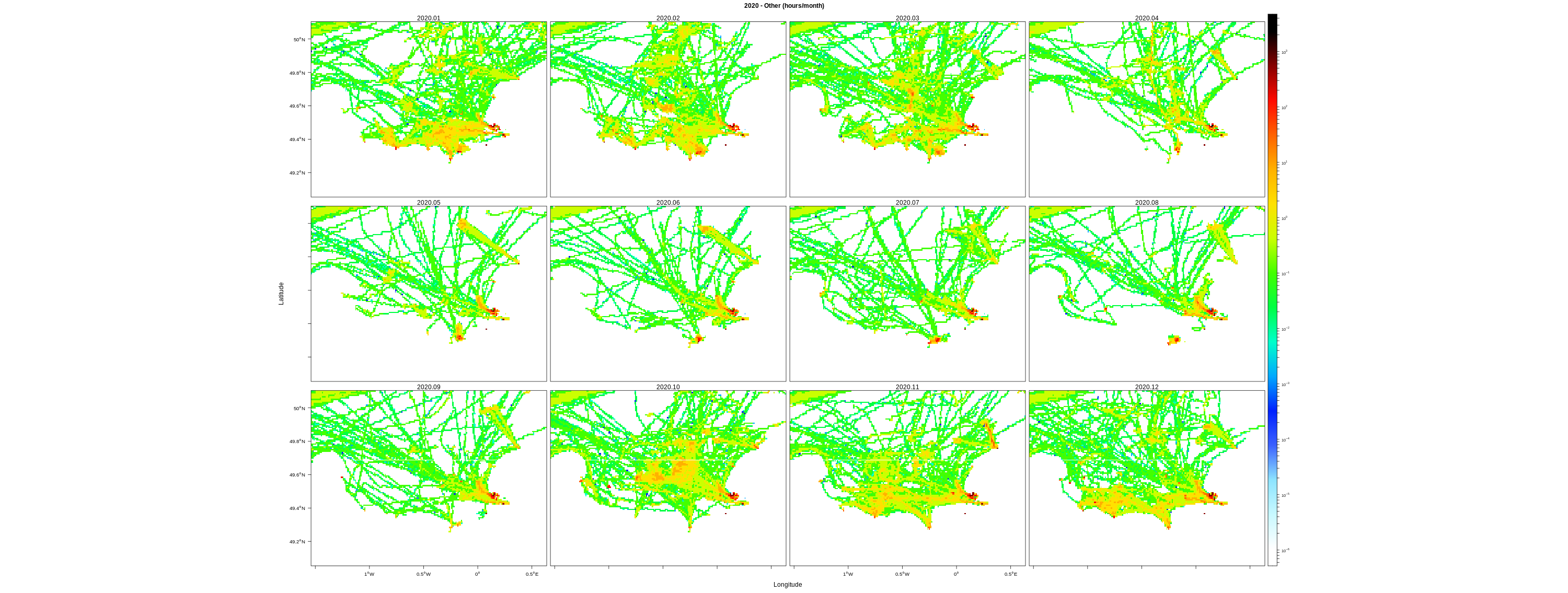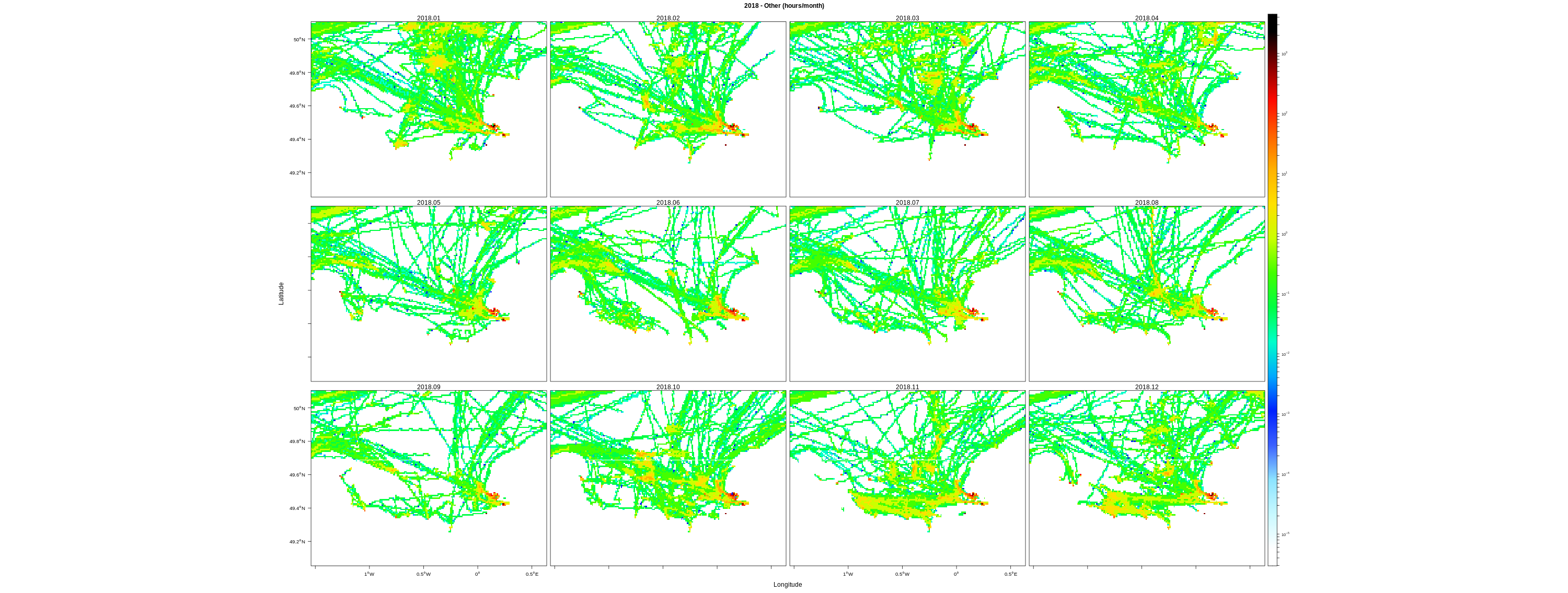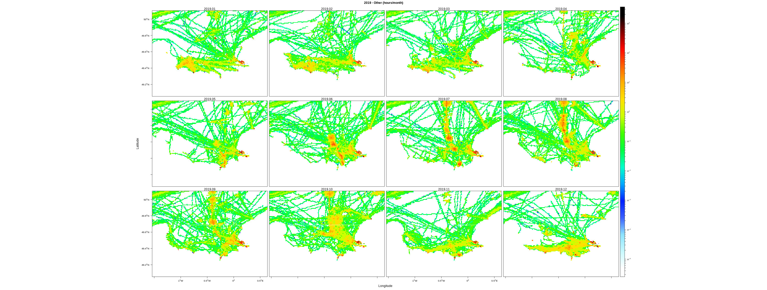 EMODnet Vessel Density maps were created by Cogea in 2019 in the framework of EMODnet Human Activities, an initiative funded by the EU Commission. The maps are based on AIS data purchased by Collecte Localisation Satellites (CLS) and ORBCOMM. The maps show shipping density in 1km*1km cells of a grid covering all EU waters (and some neighbouring areas). Density is expressed as hours per square kilometre per month. The following ship types are available:0 Other, 1 Fishing, 2 Service, 3 Dredging or underwater ops, 4 Sailing, 5 Pleasure Craft, 6 High speed craft, 7 Tug and towing, 8 Passenger, 9 Cargo, 10 Tanker, 11 Military and Law Enforcement, 12 Unknown and All ship types. Data are available by month of year. Yearly averages are also available.