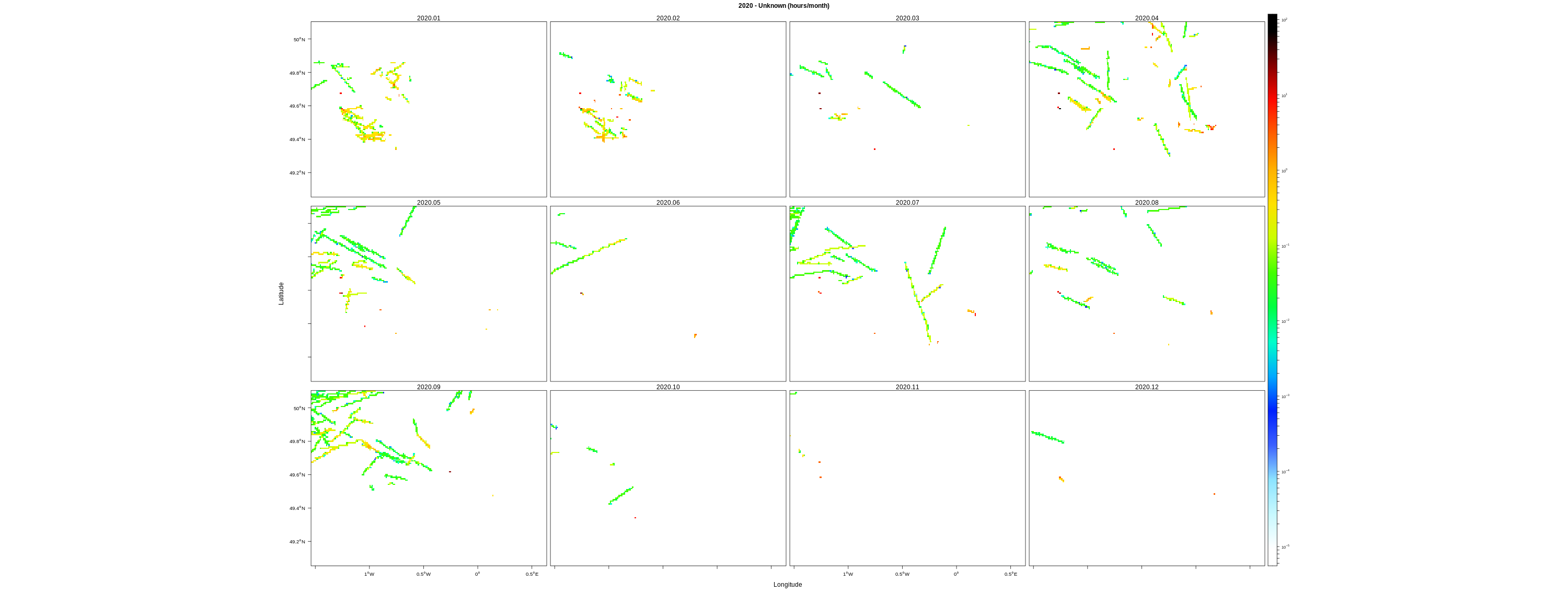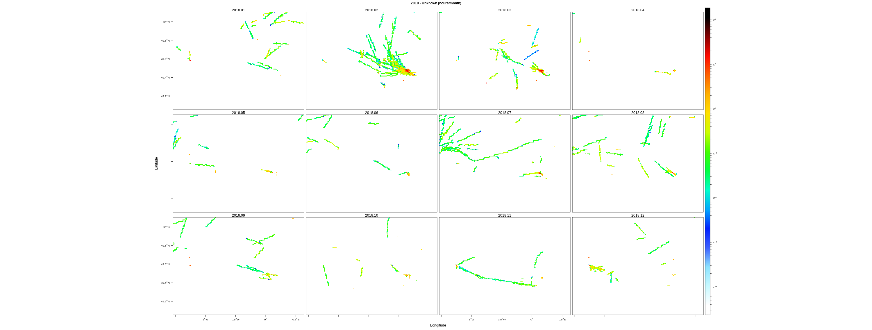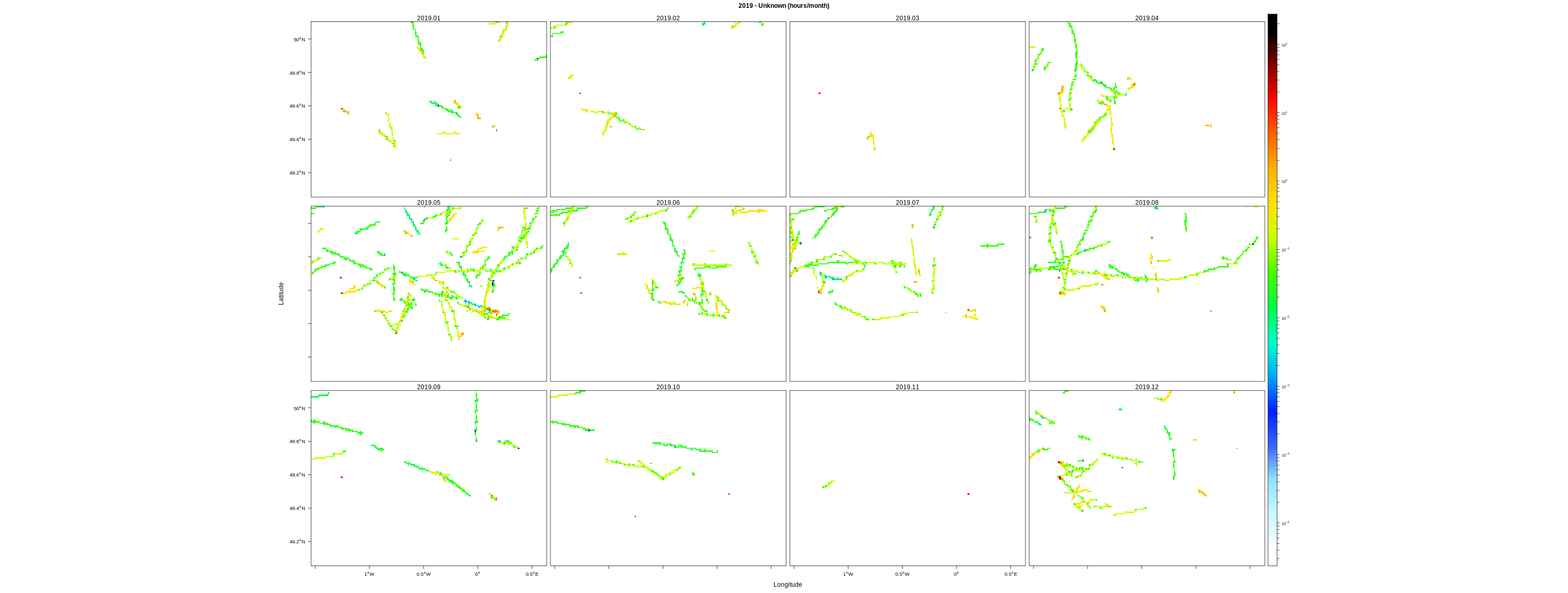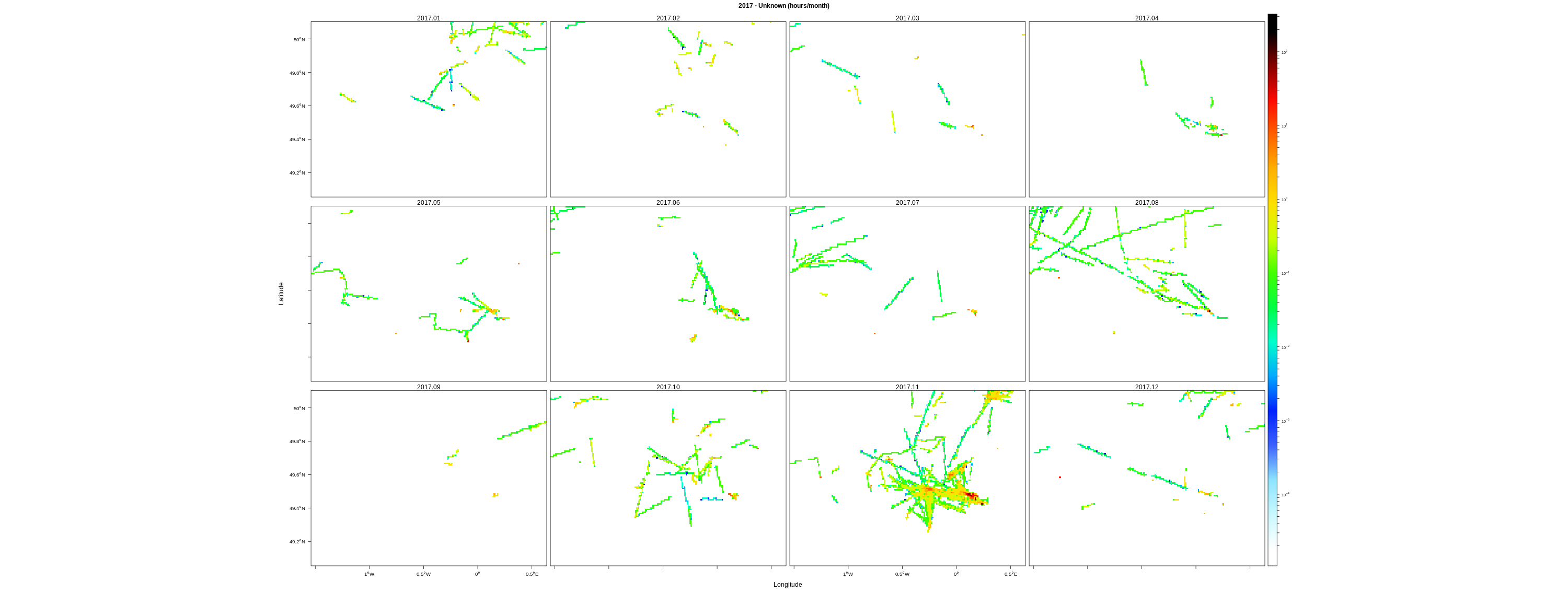 EMODnet Vessel Density maps were created by Cogea in 2019 in the framework of EMODnet Human Activities, an initiative funded by the EU Commission. The maps are based on AIS data purchased by Collecte Localisation Satellites (CLS) and ORBCOMM. The maps show shipping density in 1km*1km cells of a grid covering all EU waters (and some neighbouring areas). Density is expressed as hours per square kilometre per month. The following ship types are available:0 Other, 1 Fishing, 2 Service, 3 Dredging or underwater ops, 4 Sailing, 5 Pleasure Craft, 6 High speed craft, 7 Tug and towing, 8 Passenger, 9 Cargo, 10 Tanker, 11 Military and Law Enforcement, 12 Unknown and All ship types. Data are available by month of year. Yearly averages are also available.