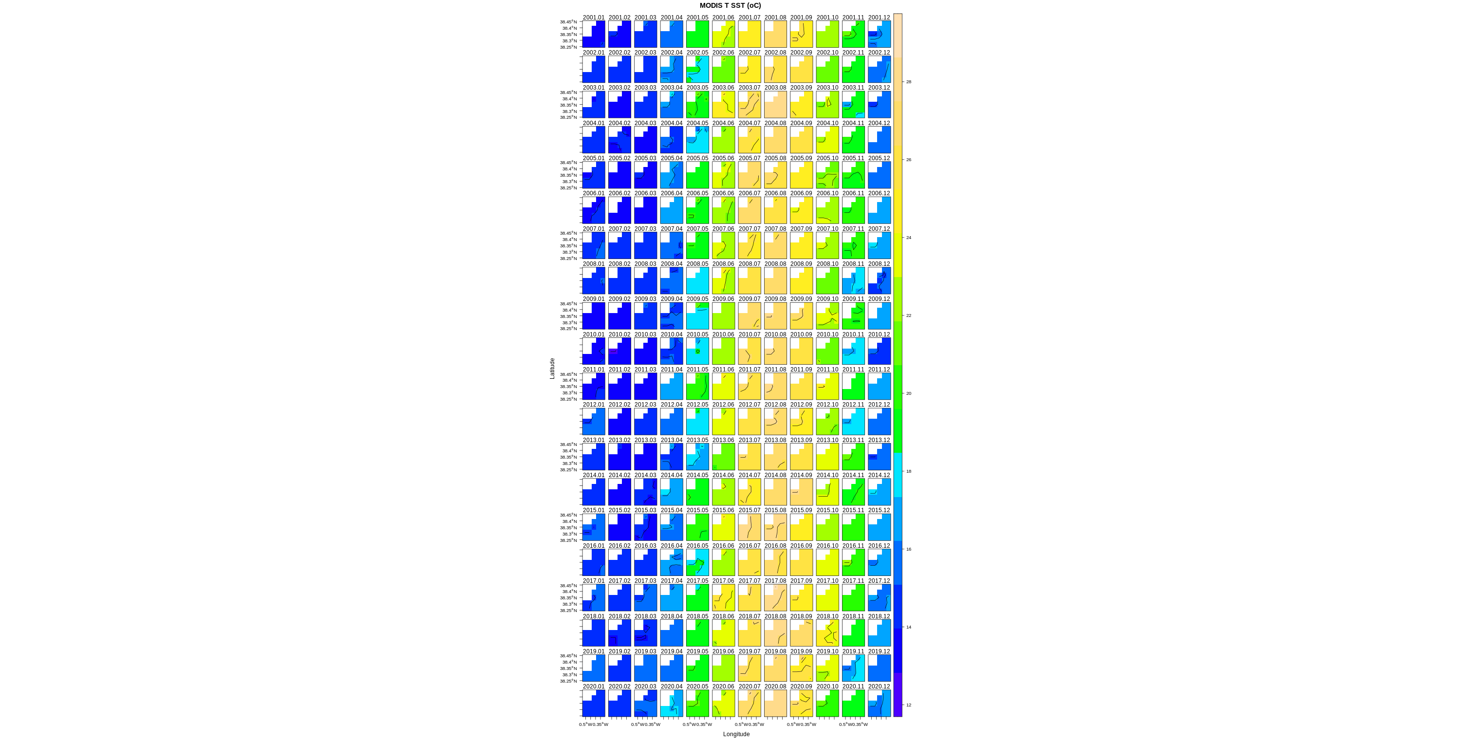 Monthly mean sea surface temperature (in degree-C at 4km resolution) derived from the MODIS-TERRA sensor (Satellite remote sensing Ocean color data): Sea surface temperature is the temperature of the water close to the sea surface. SST is a standard product from satellite-based thermal infra-red sensors, and optical sensors complemented with infrared bands.