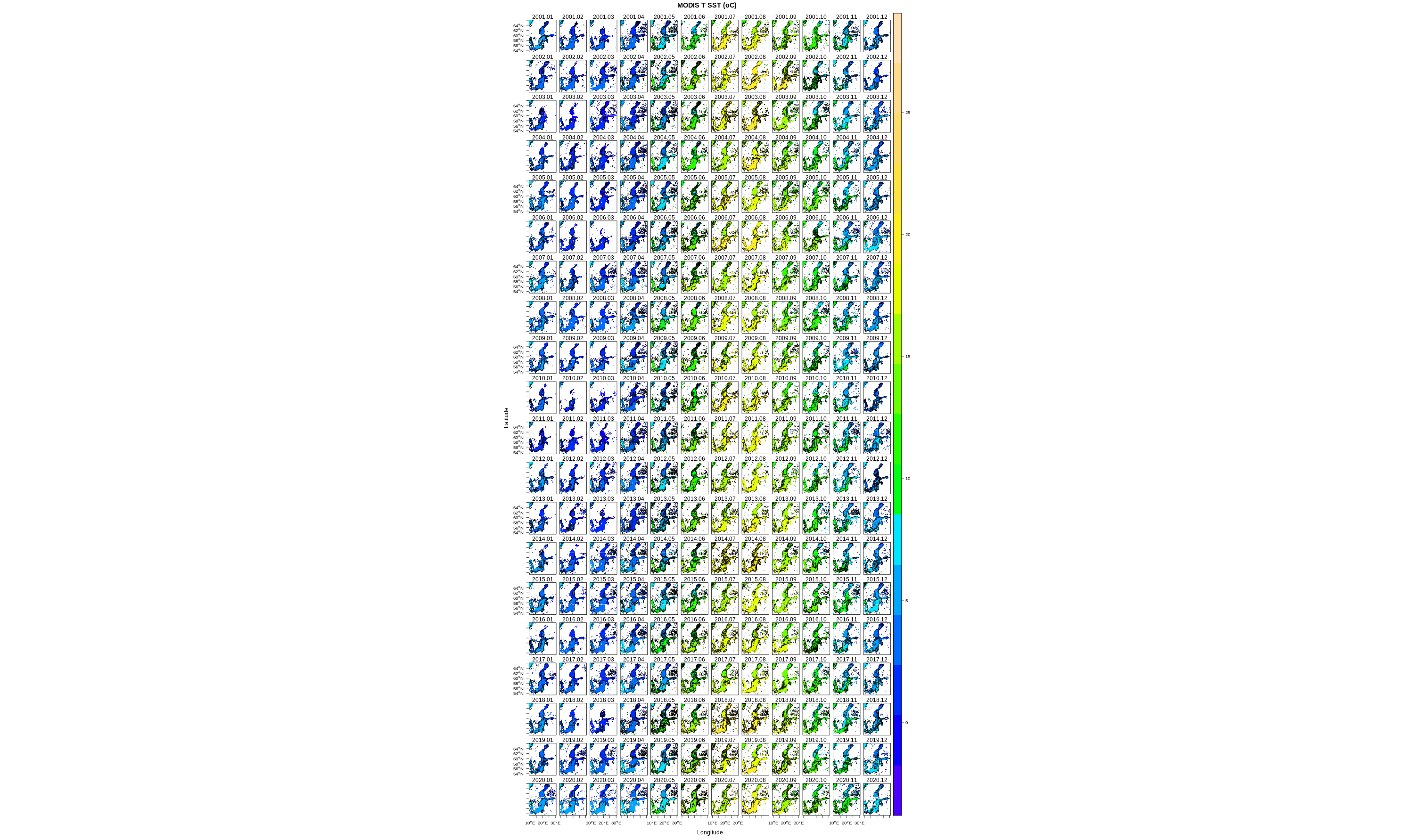 Monthly mean sea surface temperature (in degree-C at 4km resolution) derived from the MODIS-TERRA sensor (Satellite remote sensing Ocean color data): Sea surface temperature is the temperature of the water close to the sea surface. SST is a standard product from satellite-based thermal infra-red sensors, and optical sensors complemented with infrared bands.