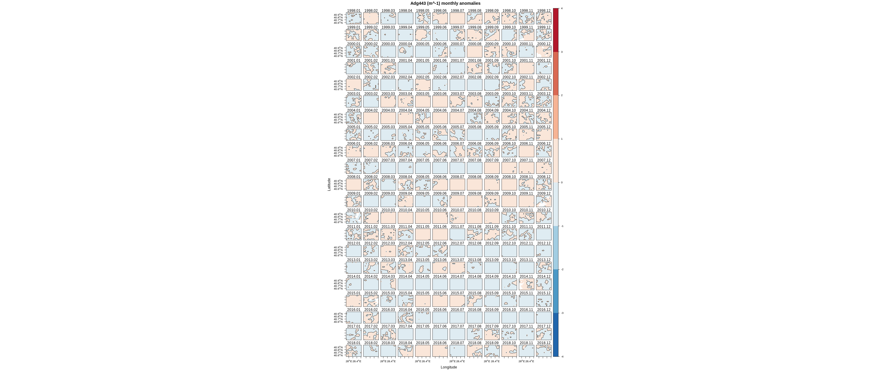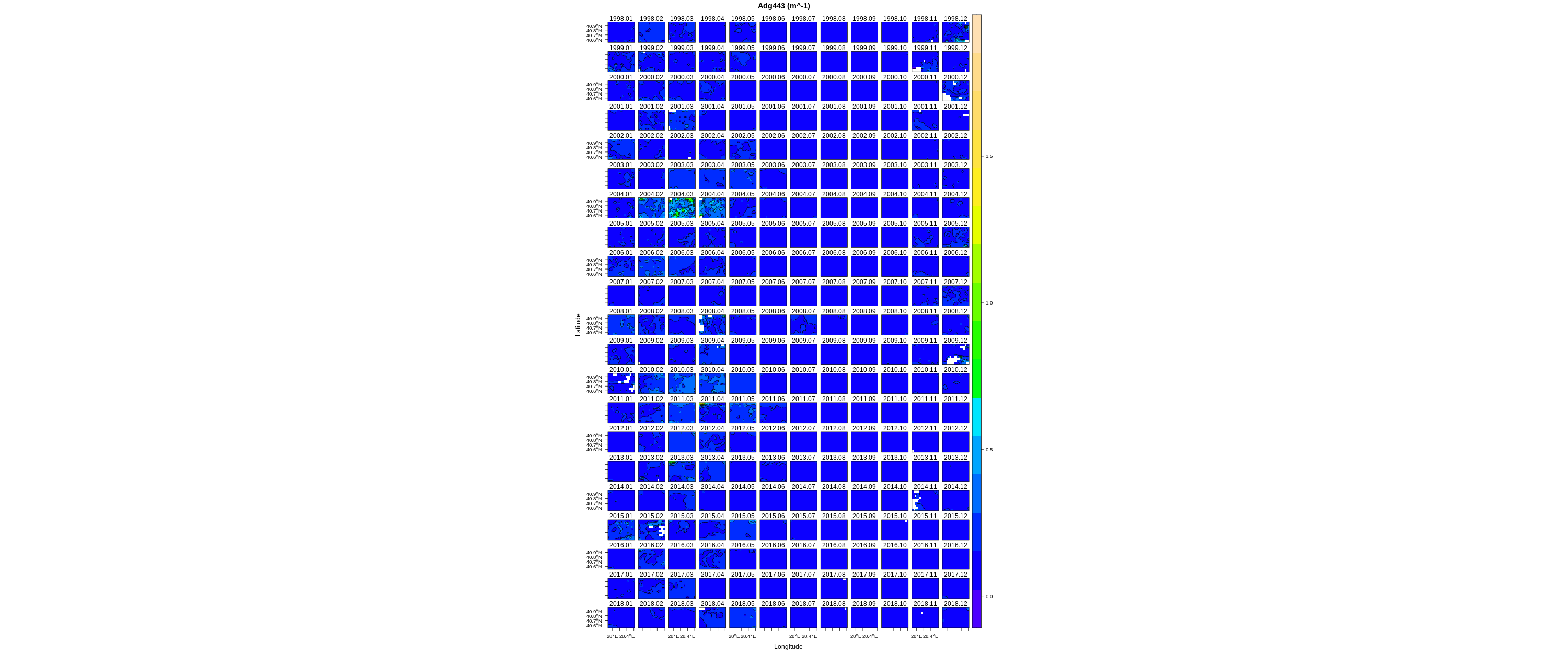 Absorption Coefficient of colored detrital matter at 443nm (adg in m-1): The absorption coefficient adg represents the fraction of incident light absorbed by both detrital particles and colored dissolved organic matter (CDOM). Dissolved organic matter is an important component of the oceanic carbon cycle. It is also used as proxy to assess the impact of terrigenous inputs in coastal waters.